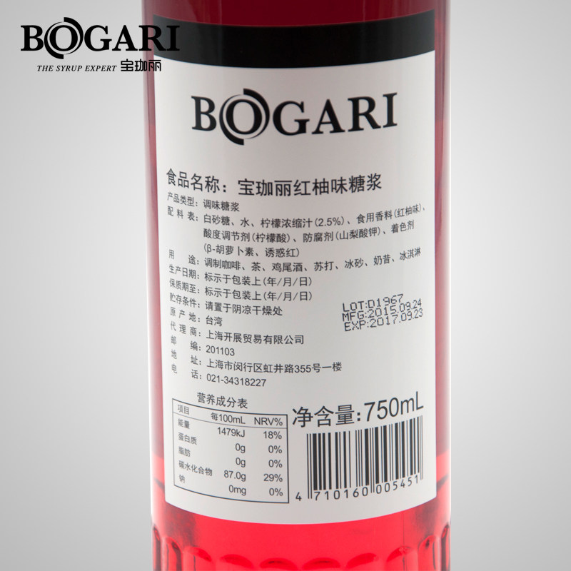 天猫梯信食品专营店,台湾bogari /宝珈丽红柚红西柚糖浆,调酒饮品 2瓶送 压嘴1个 赠品不叠加
