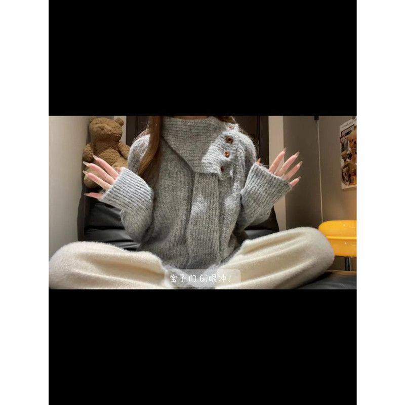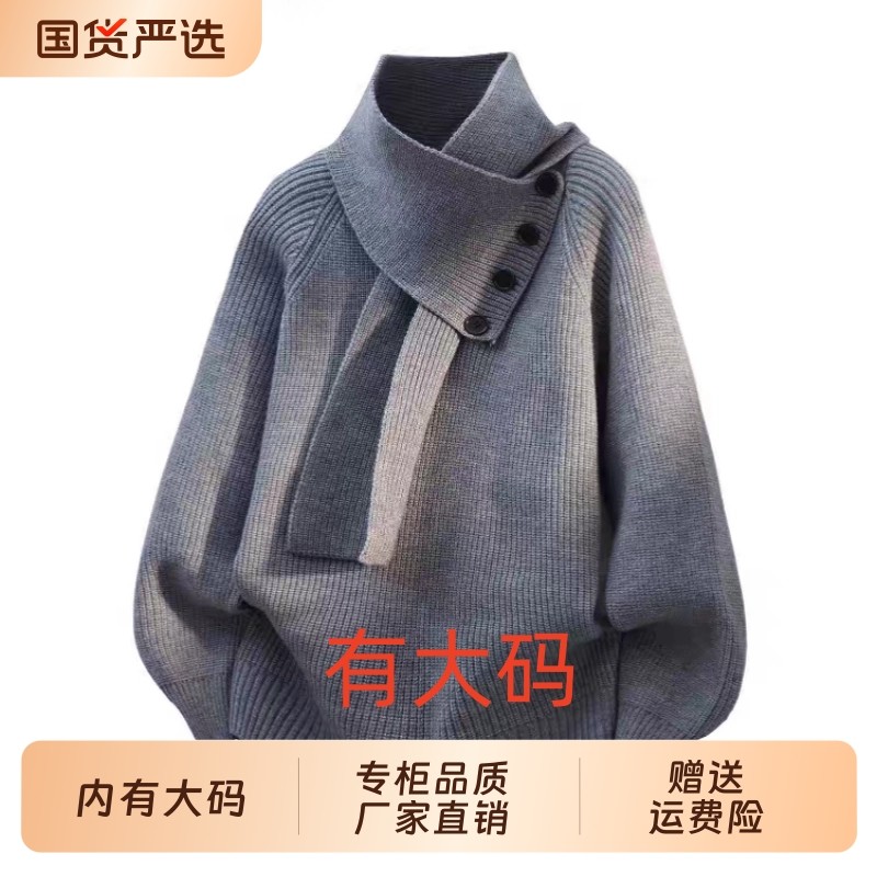 天猫1688官方工厂,设计感灰色秋冬高领纽扣针织衫女慵懒风高级感大码内搭毛衣上衣厚