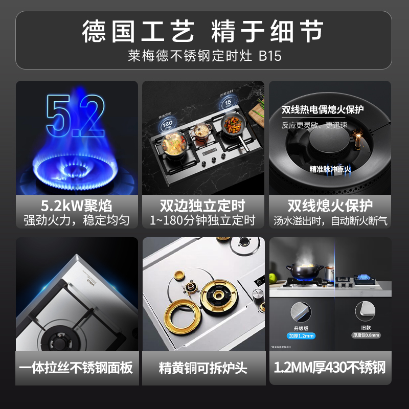 天猫莱梅德电器旗舰店,德国莱梅德三眼燃气灶定时猛火灶,加厚不锈钢大面板 双边独立定时 5.2KW大火