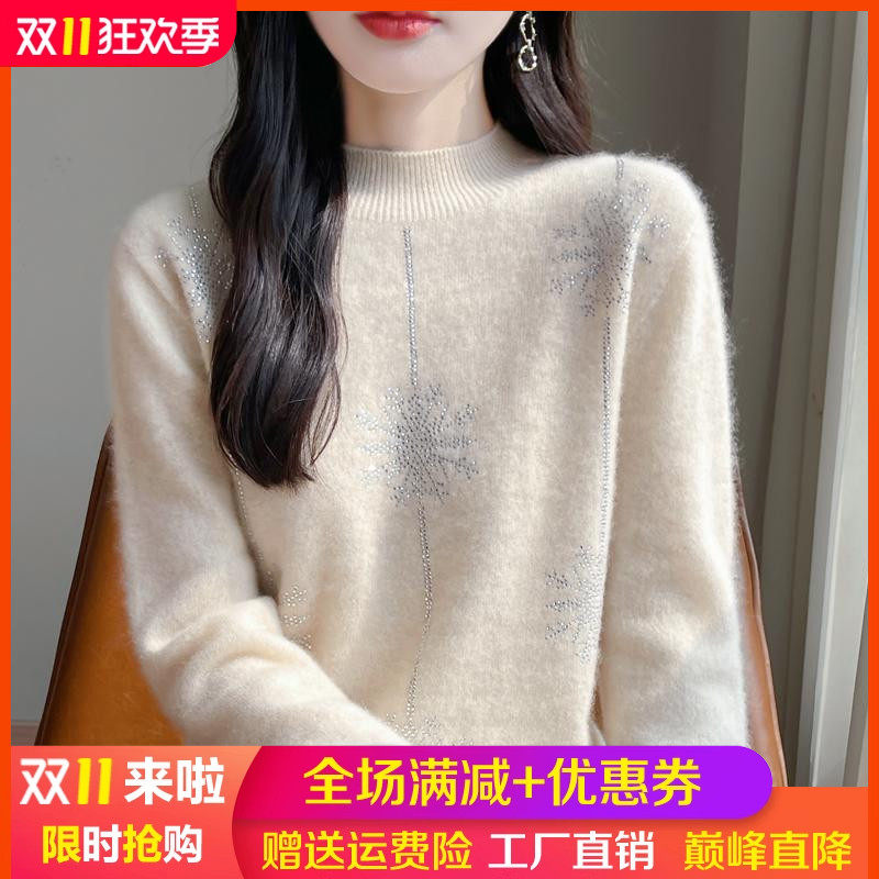 100%纯羊绒衫女一线成衣半高领雪花镶钻针织毛衣宽松羊毛打底上衣