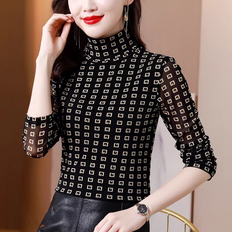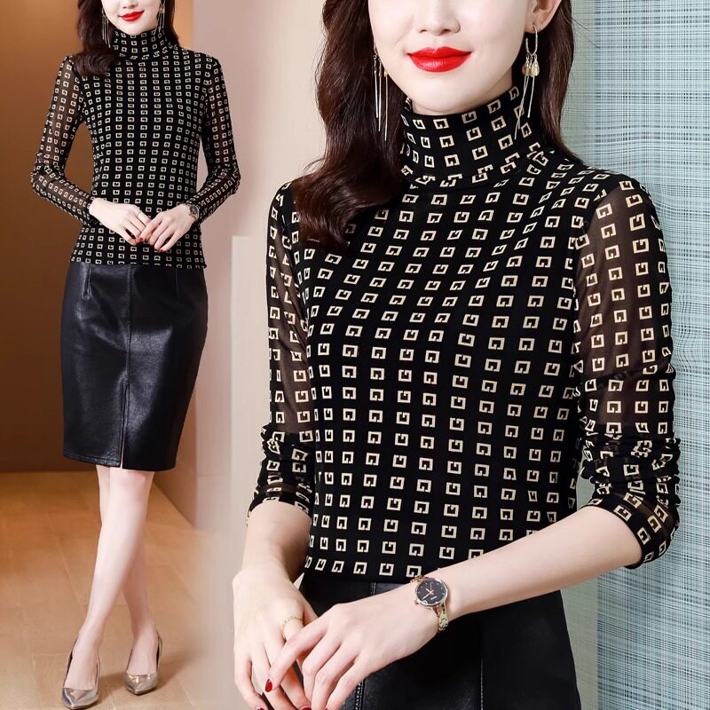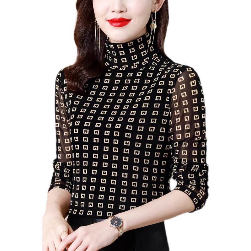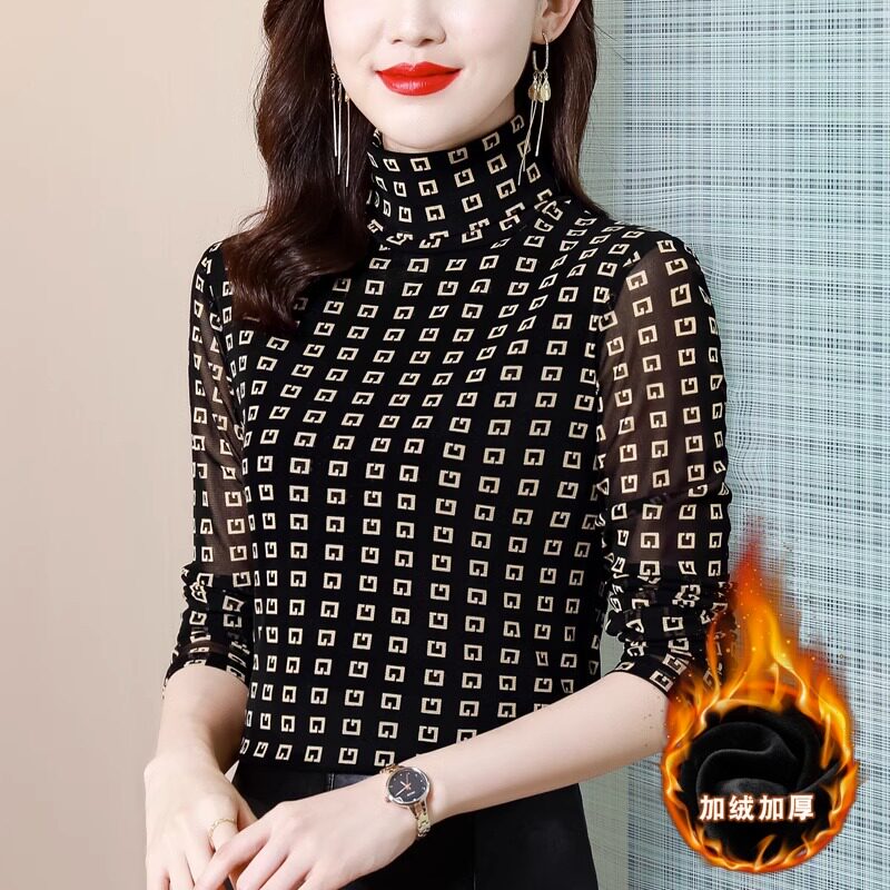 妈妈保暖内衣女士加绒加厚秋冬季大码长袖t恤网纱上衣高领打底衫
