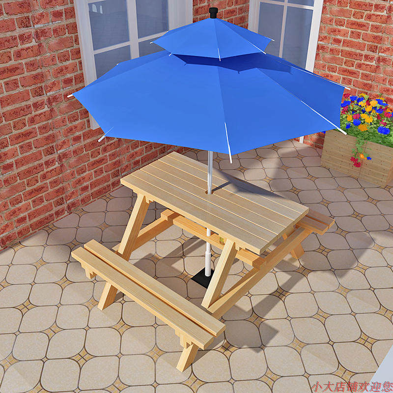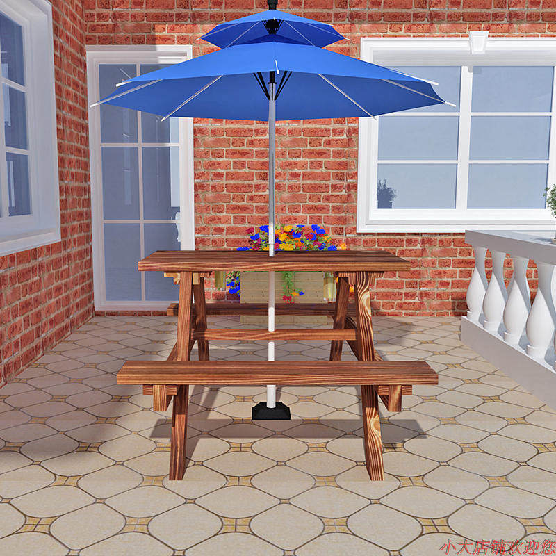 松木户外连体桌椅阳台桌椅现代复古碳化松木桌椅带伞户外连体桌