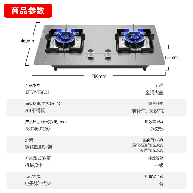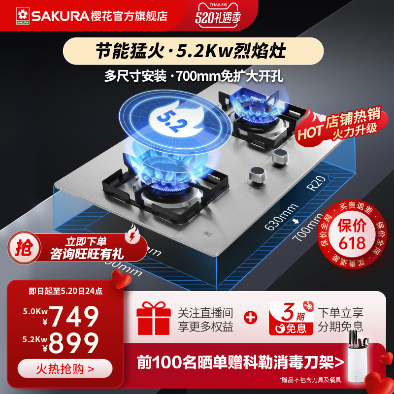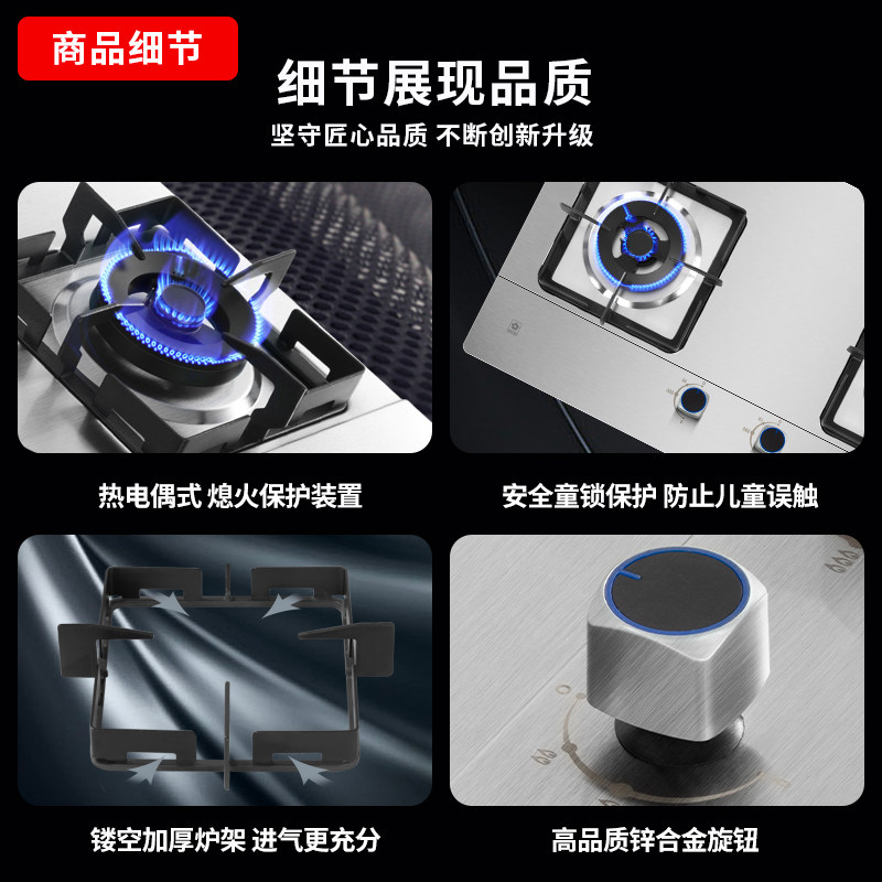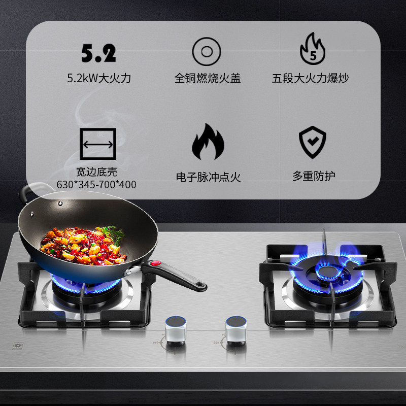 天猫樱花卫厨官方旗舰店,[爆款]樱花不锈钢燃气灶双灶家用嵌入式天然气灶液化气台式TSC01,5.2KW大火力 五段火力可调节 一级能效