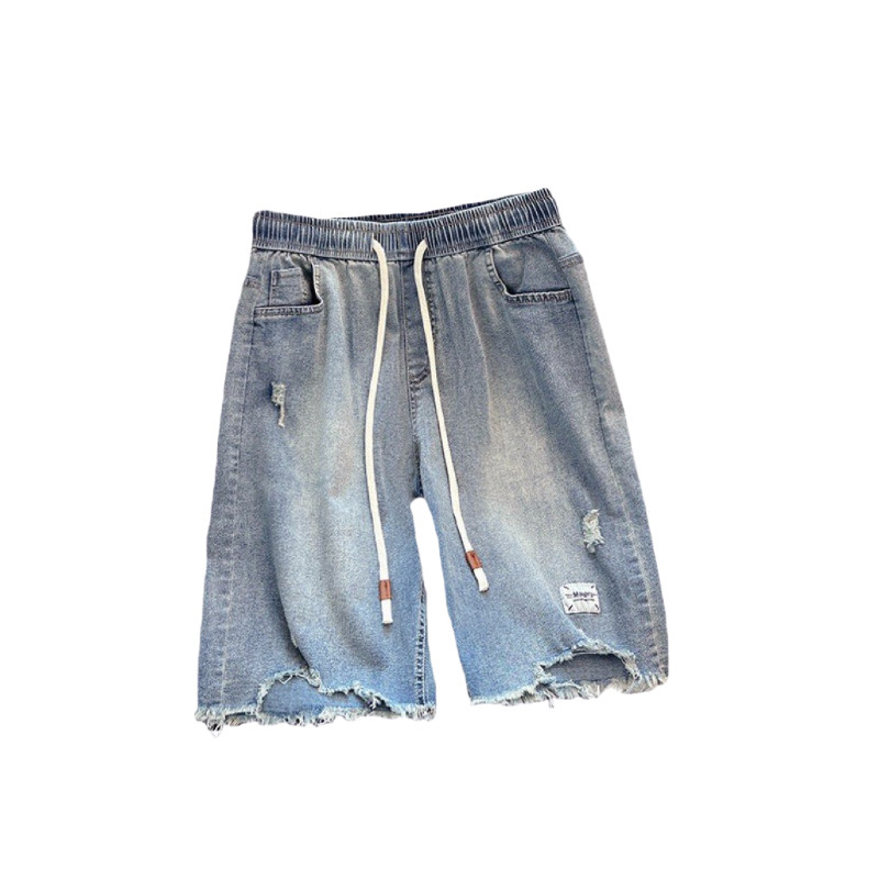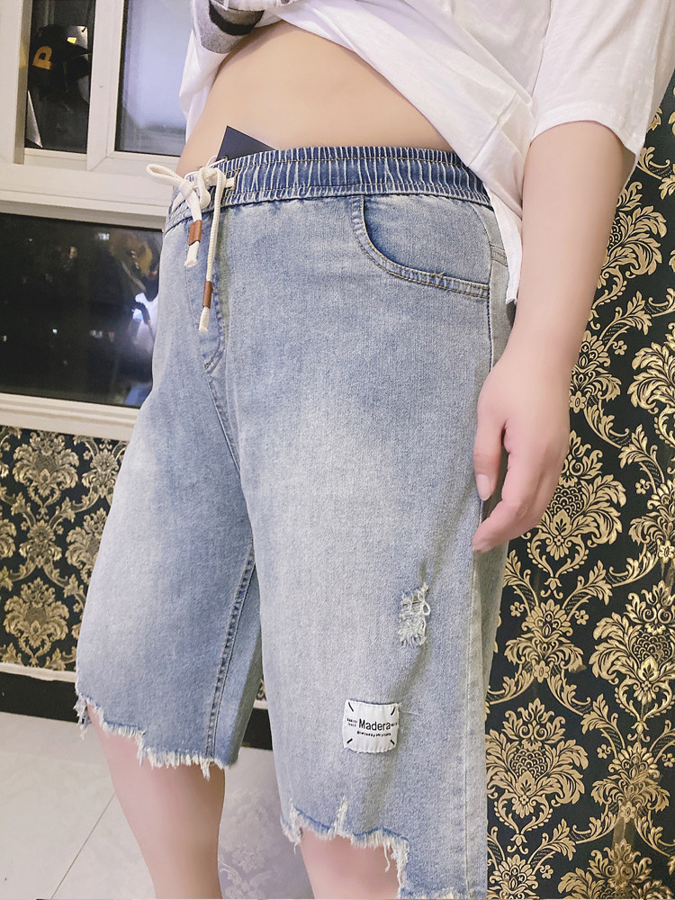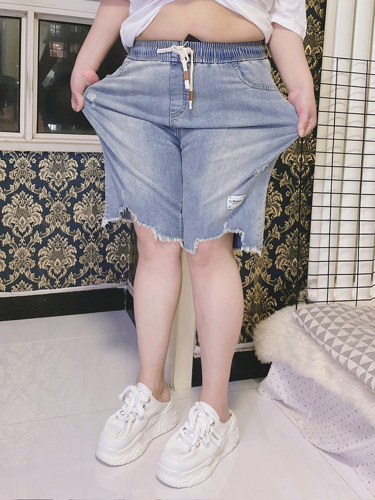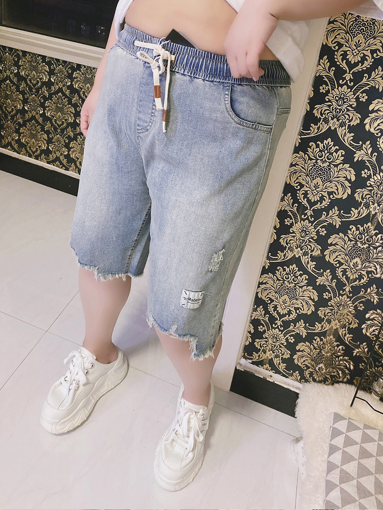 240斤潮流设计感五分裤遮肉显瘦破洞牛仔短裤hello胖妞特大码女装
