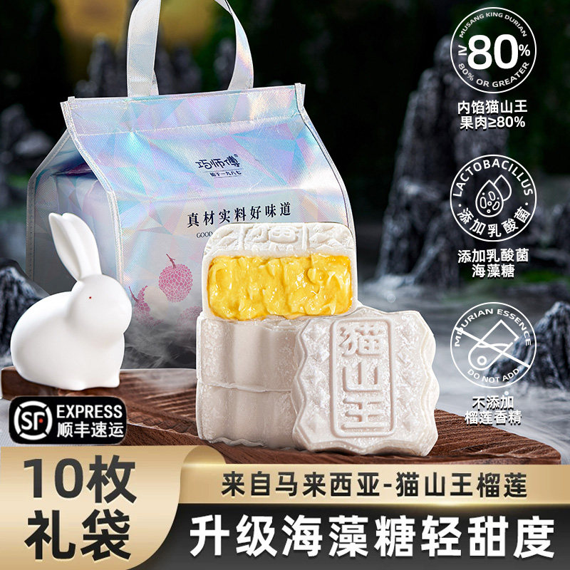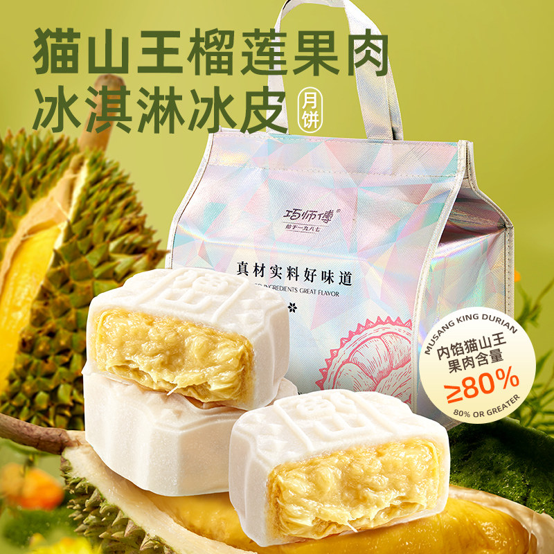巧师傅猫山王榴莲果肉冰皮月饼荔枝水果广式月饼团购中秋送礼盒装