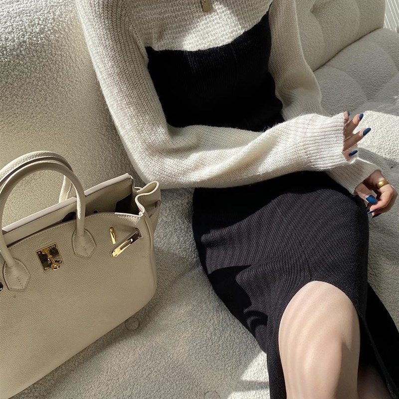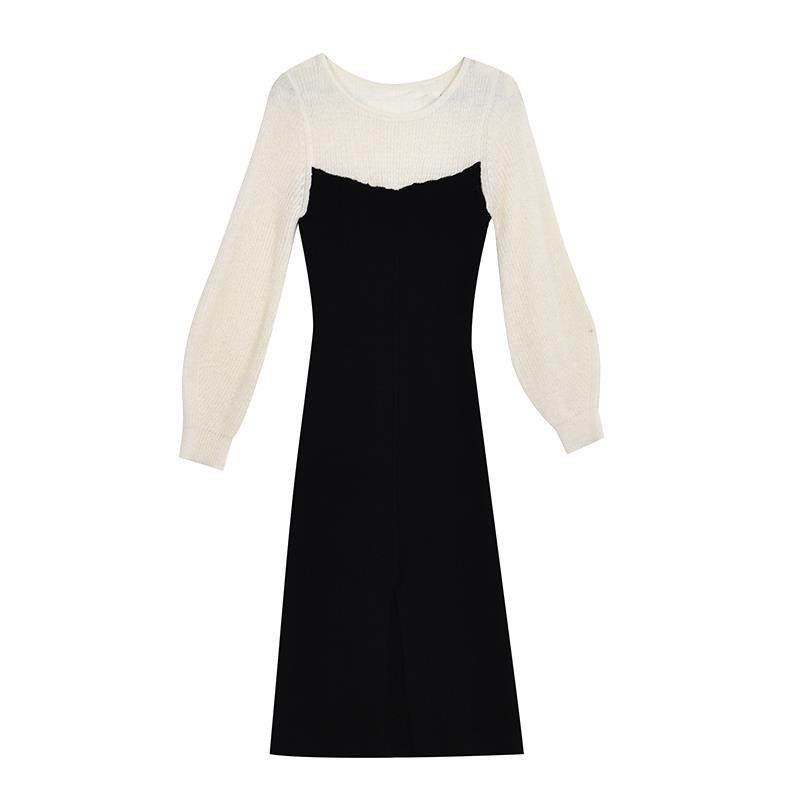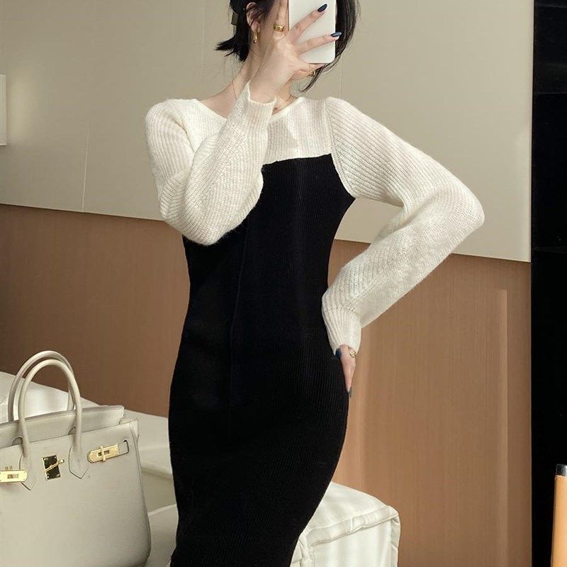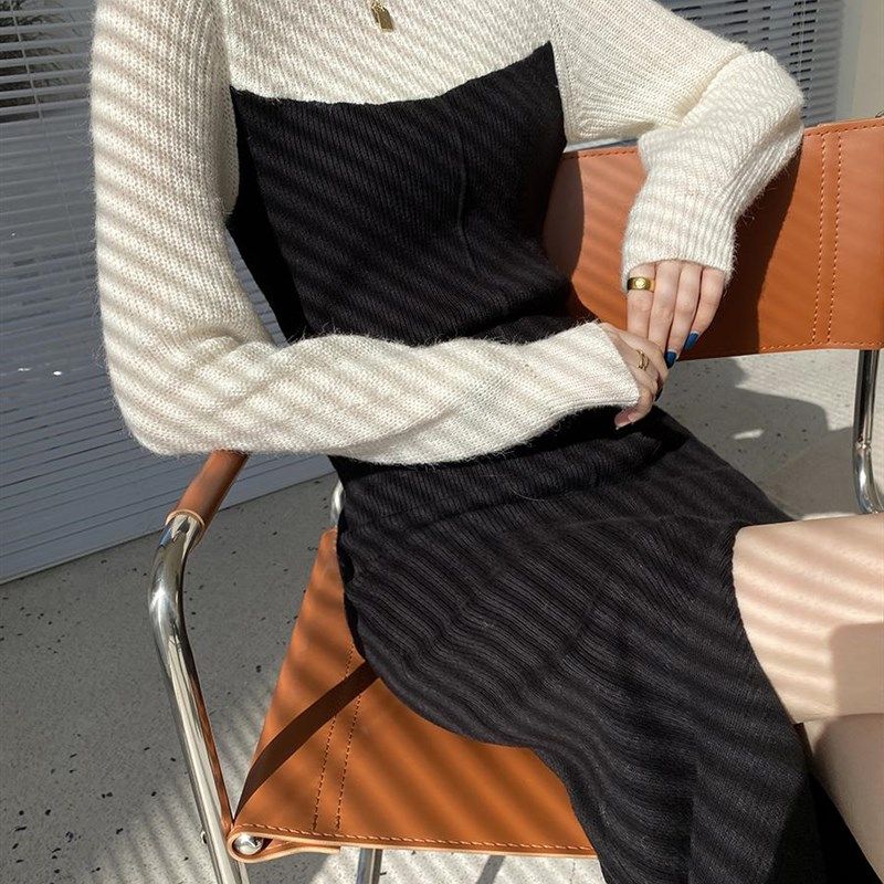 淘宝溪田集严选店的小店38,配大衣内搭黑白拼接毛衣打底裙2022秋季新款中长款开叉针织连衣裙