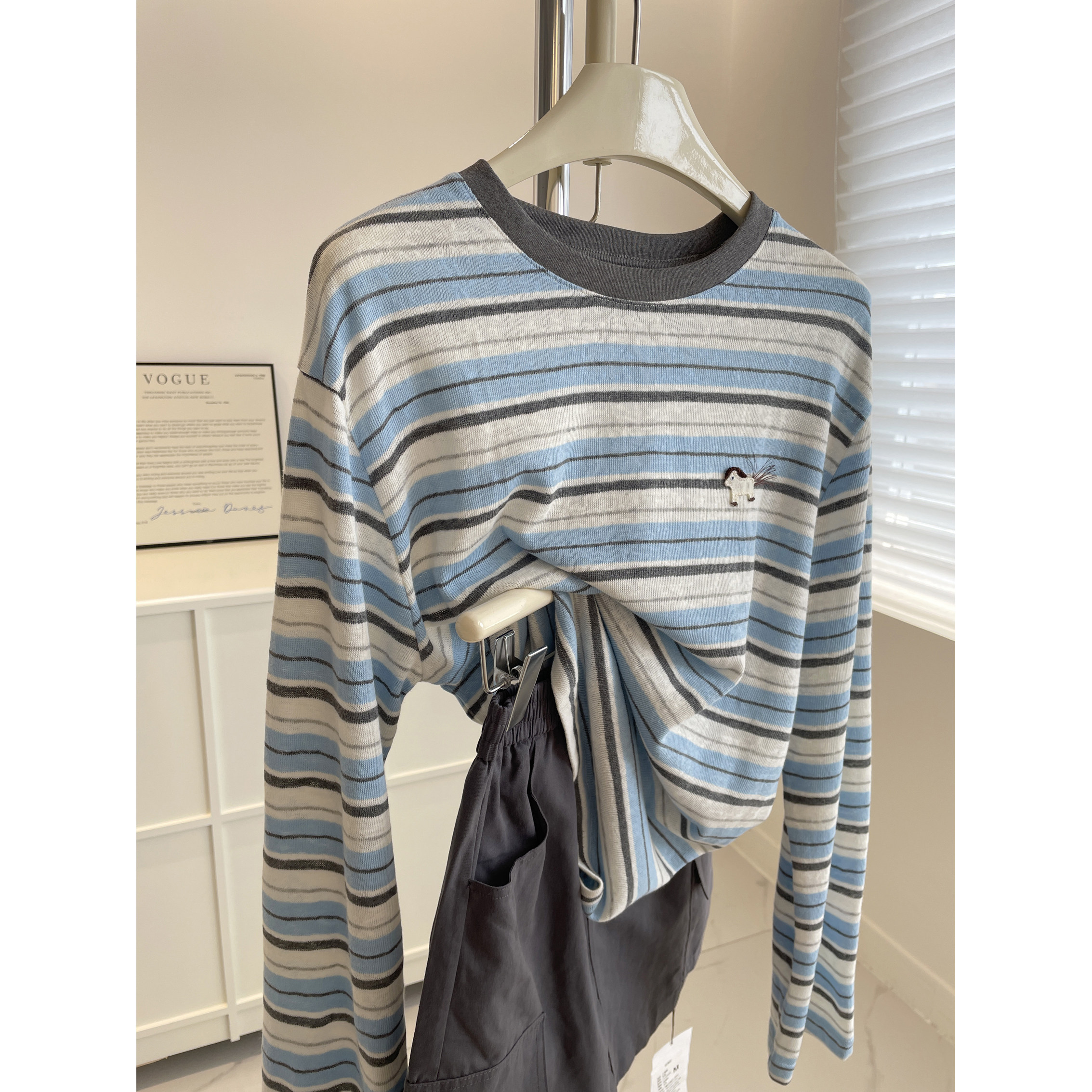 淘宝xixi西西家女装,显白撞色灰蓝条纹长袖t恤