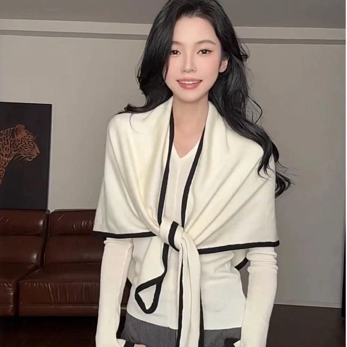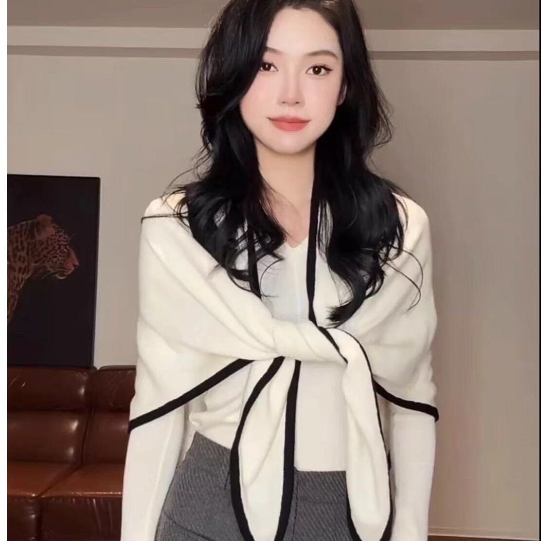 秋季实拍欧洲款V领拼接小众针织长袖打底衫上衣包芯纱两件套女装