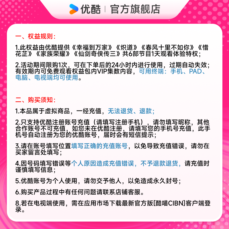天猫优酷会员官方旗舰店,优酷6部内容观看体验特权24小时有效
