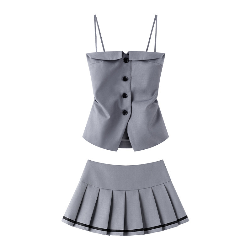 淘宝MILK PERPER,MILK PERPER 时尚单排扣吊带上衣两件套甜辣高腰百褶裙学院风套装