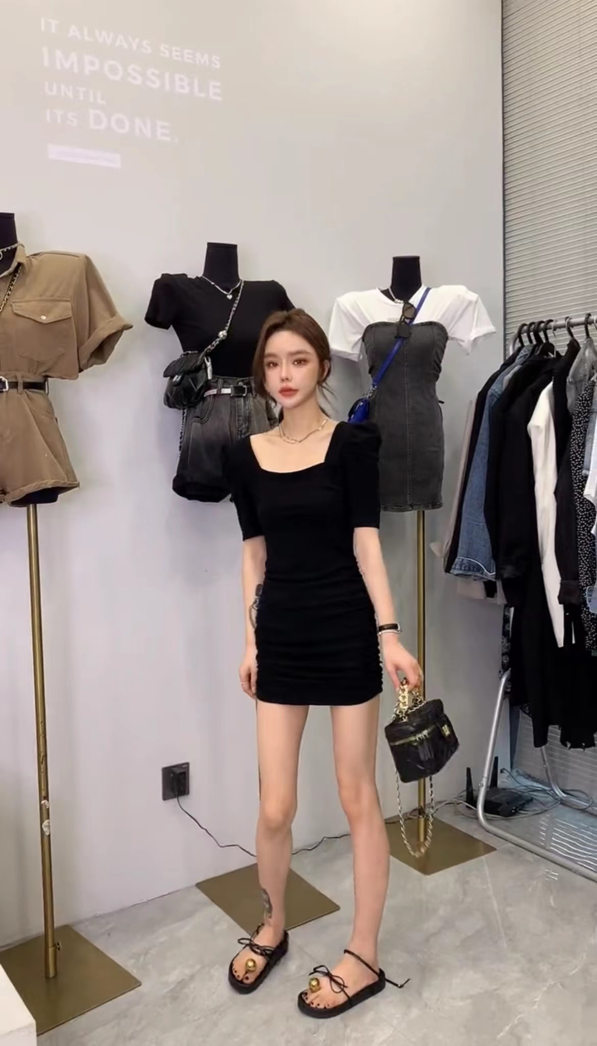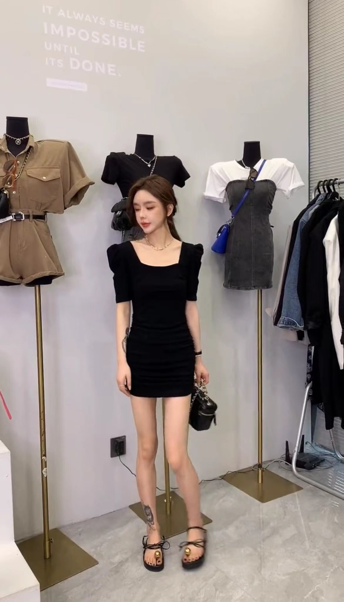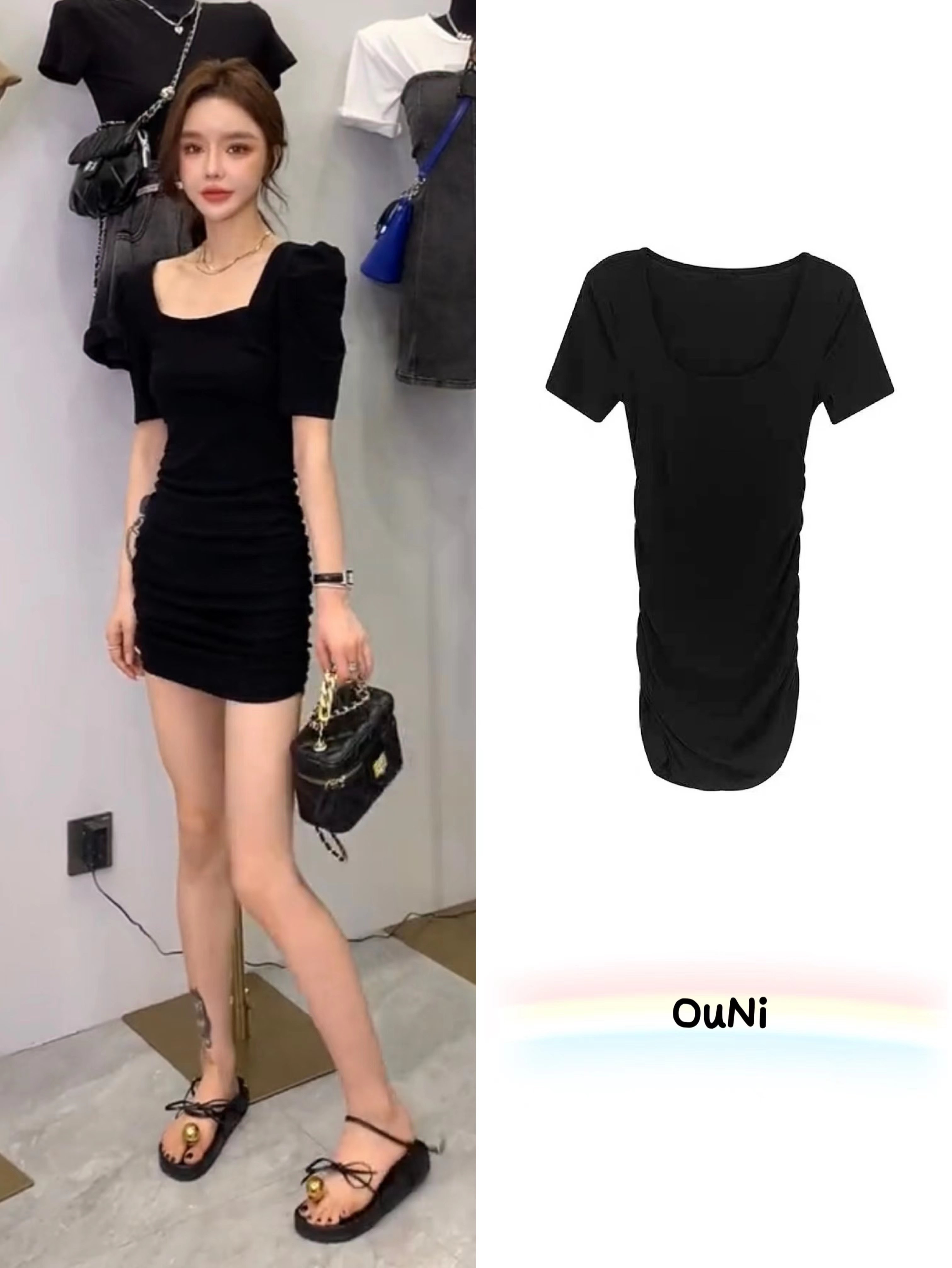 淘宝欧尼的韩系女装,方领显瘦小黑裙女2024夏季新款泡泡袖性感修身皱褶包臀裙连衣裙女