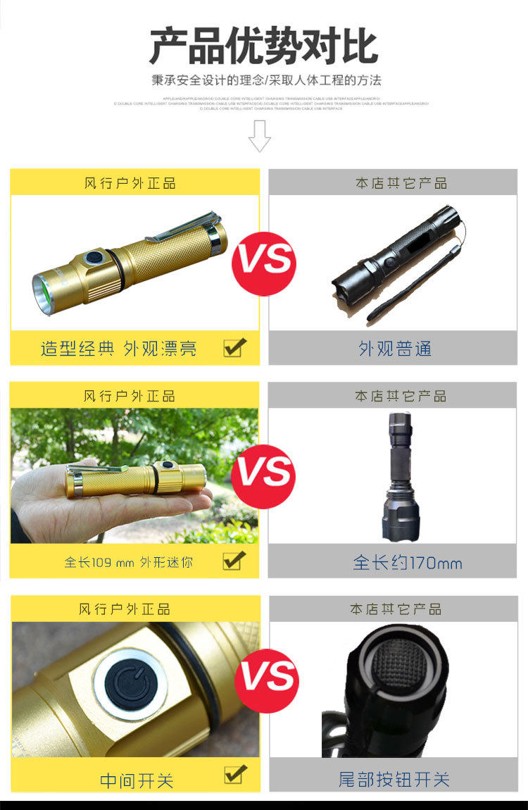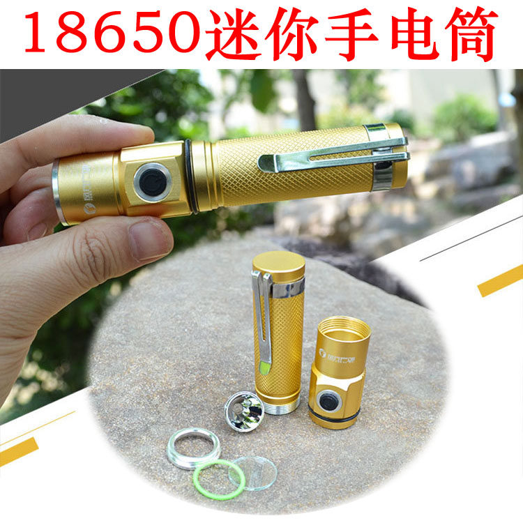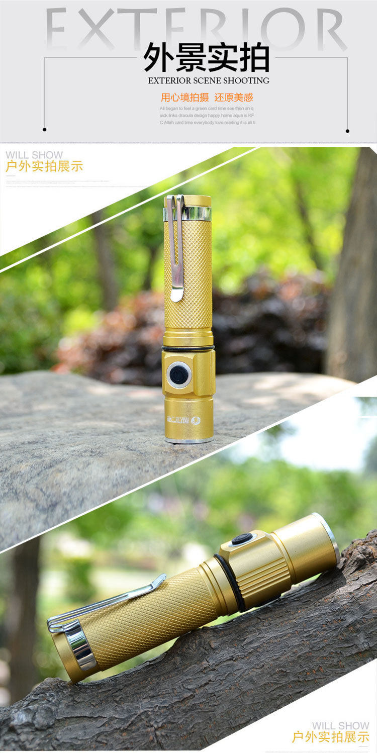 迷你18650充电强光手电筒金色中间开关带笔夹家用防水防爆手电筒