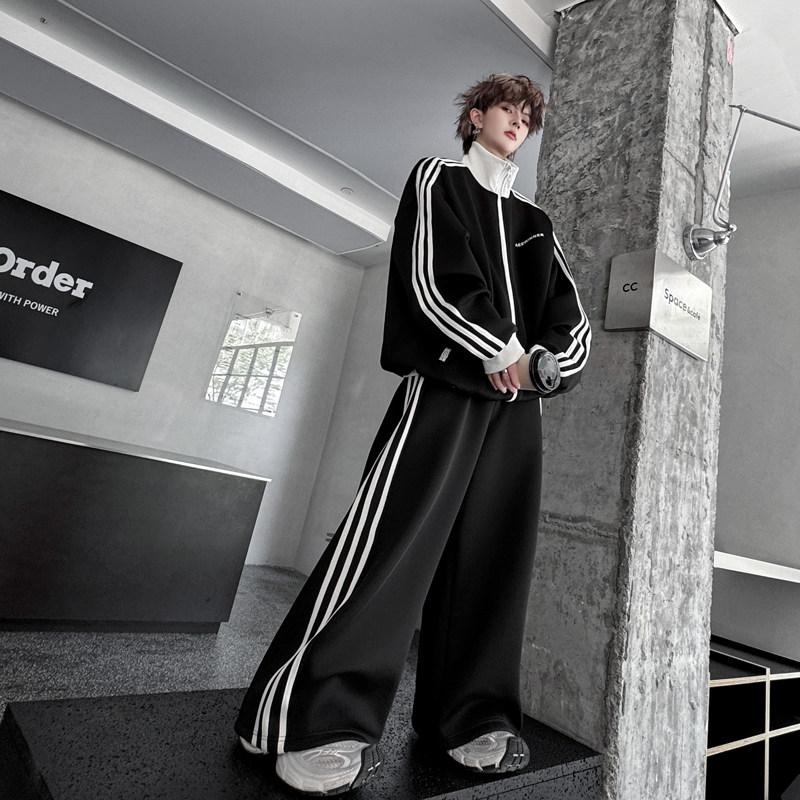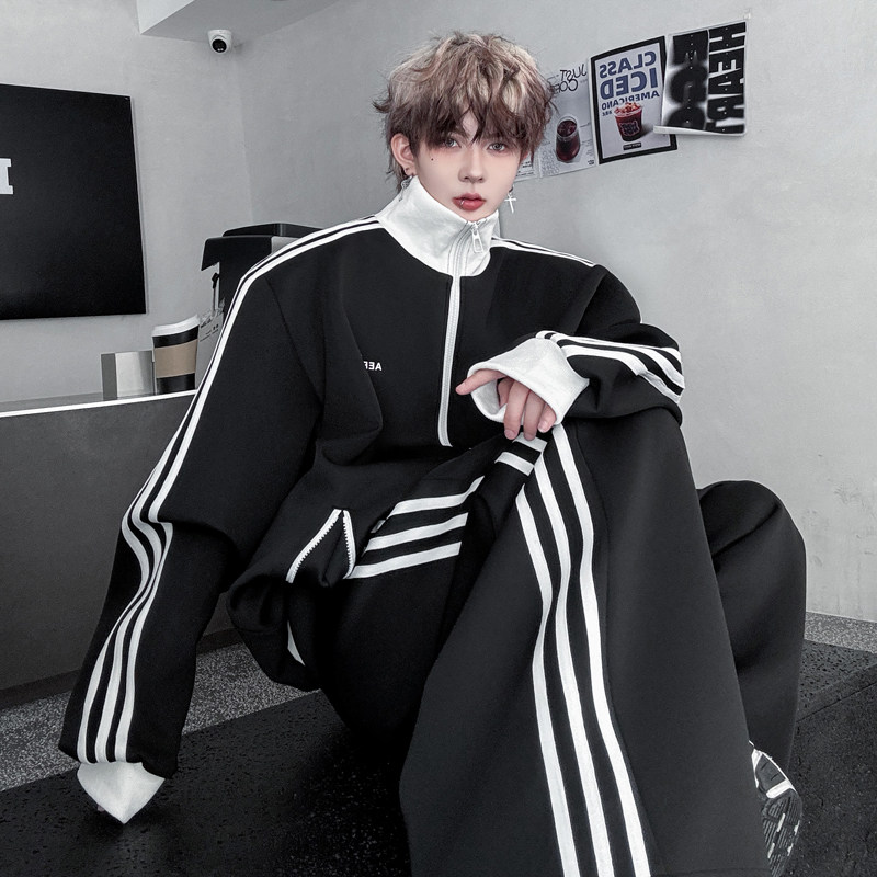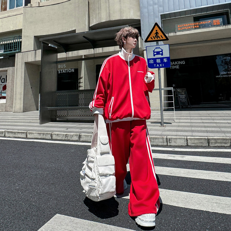 淘宝我爱文艺美型男,美式红色运动风立领夹克套装男女款潮牌三条杠宽松休闲长裤两件套