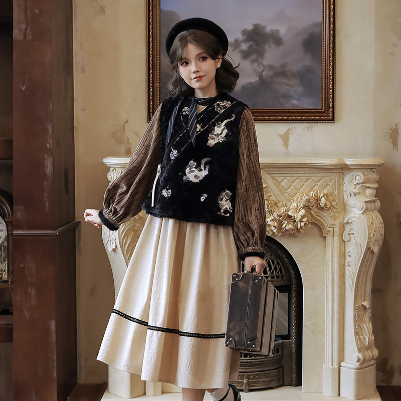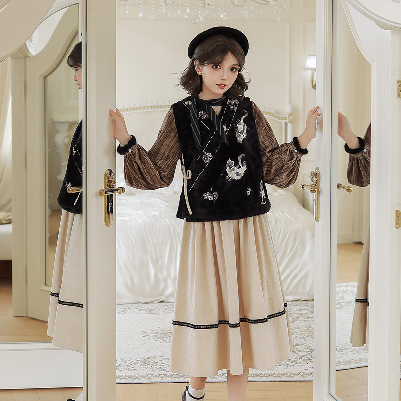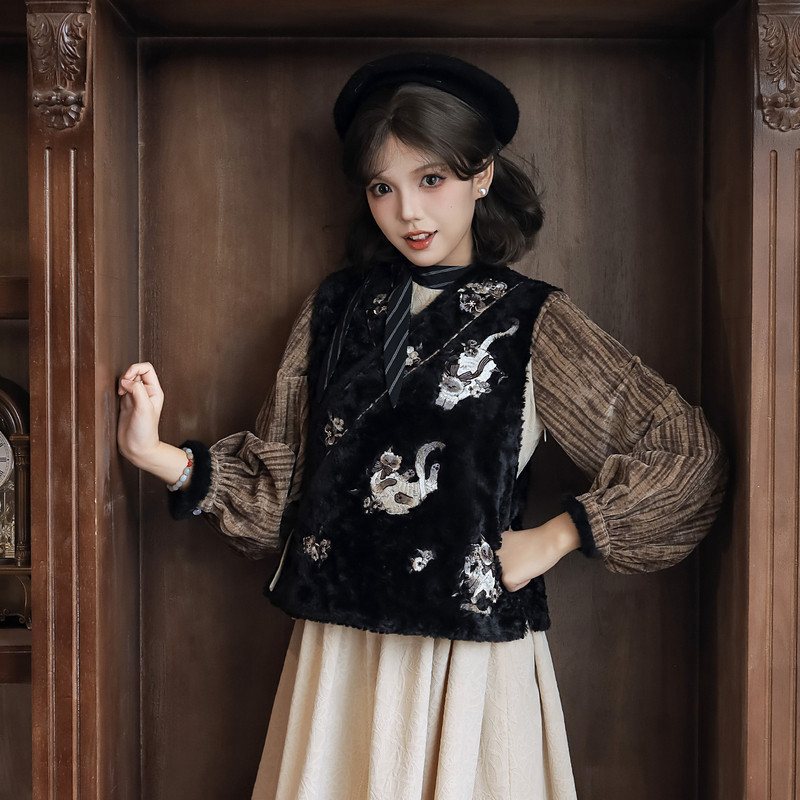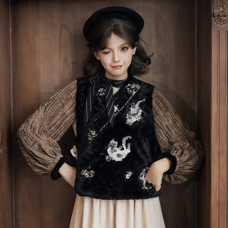 天猫汉尚华莲旗舰店,汉尚华莲[逻辑猫]原创汉服女黑色毛绒比甲马甲日常连衣裙套装秋冬