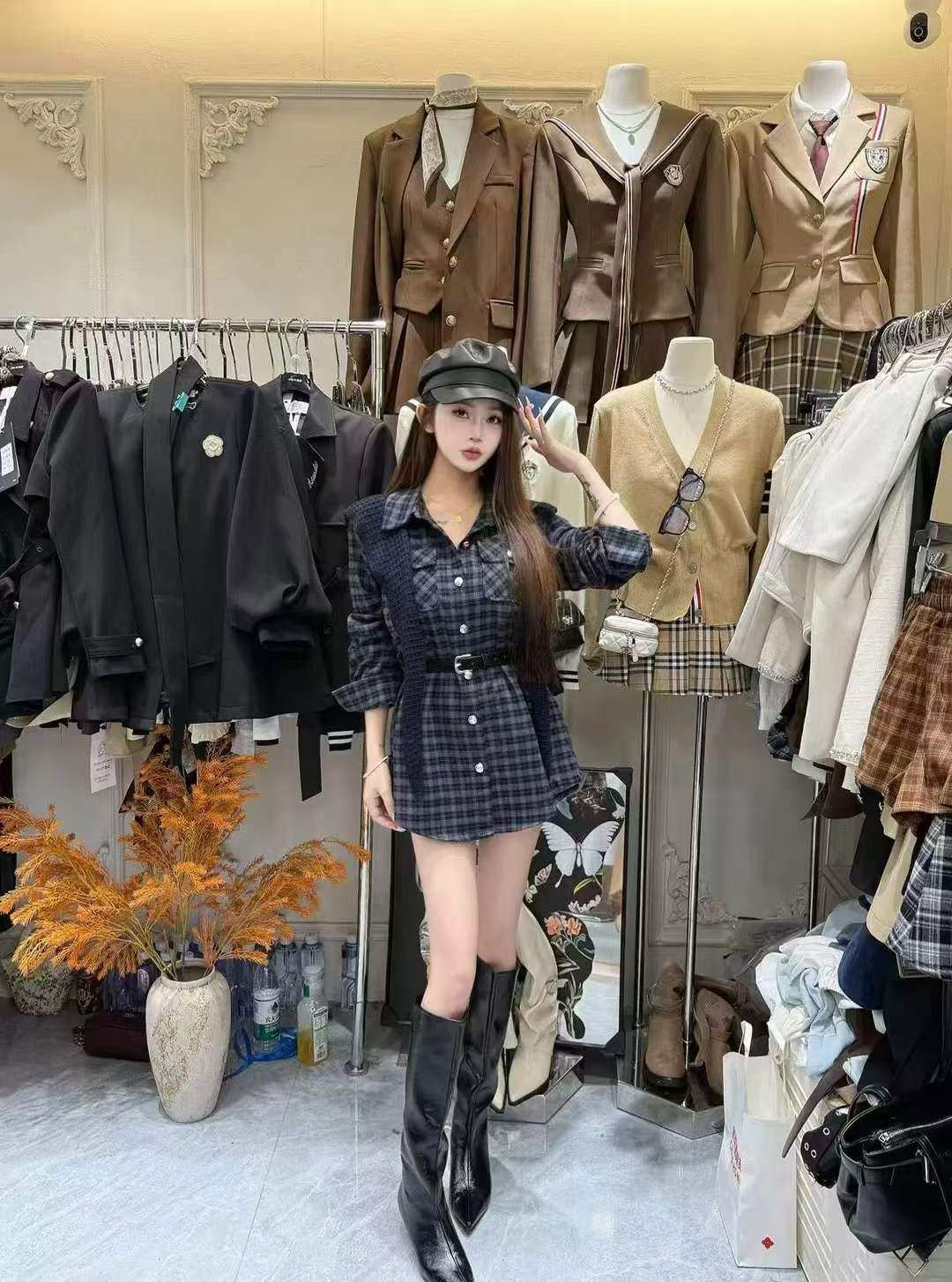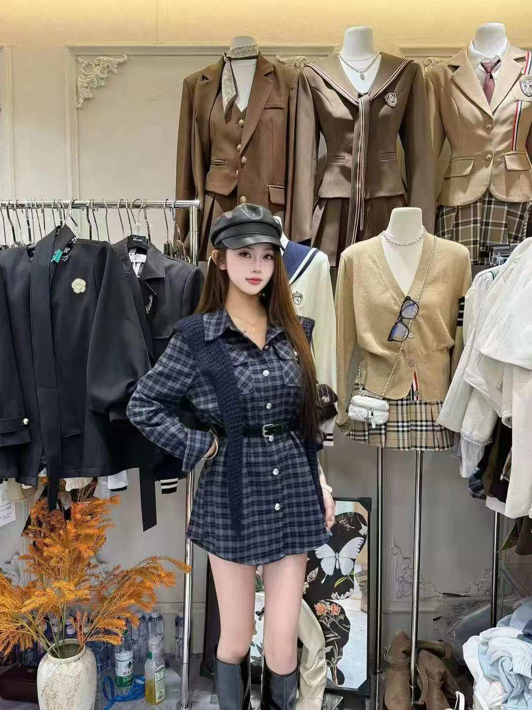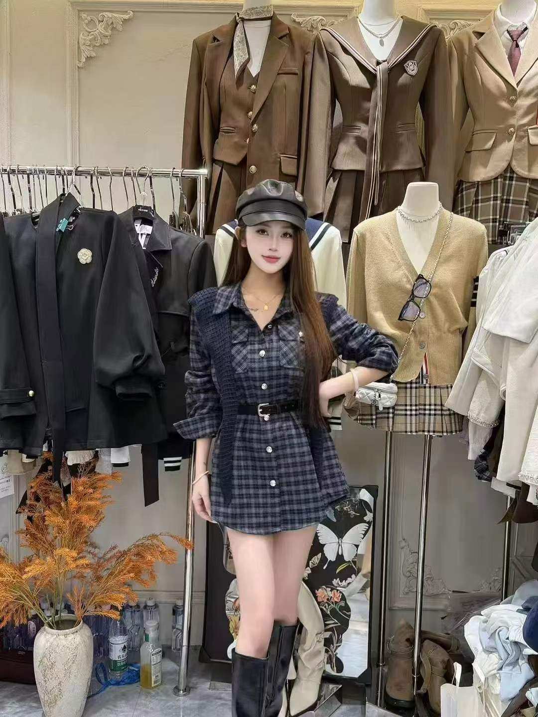 淘宝KAKAB,复古减龄少女休闲格子衬衫+格子短裤套装(配腰带,披肩)