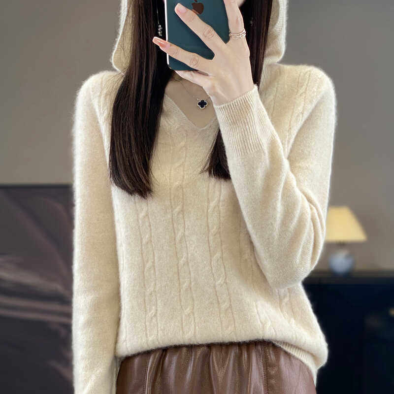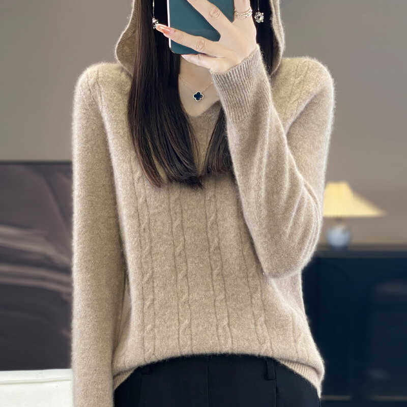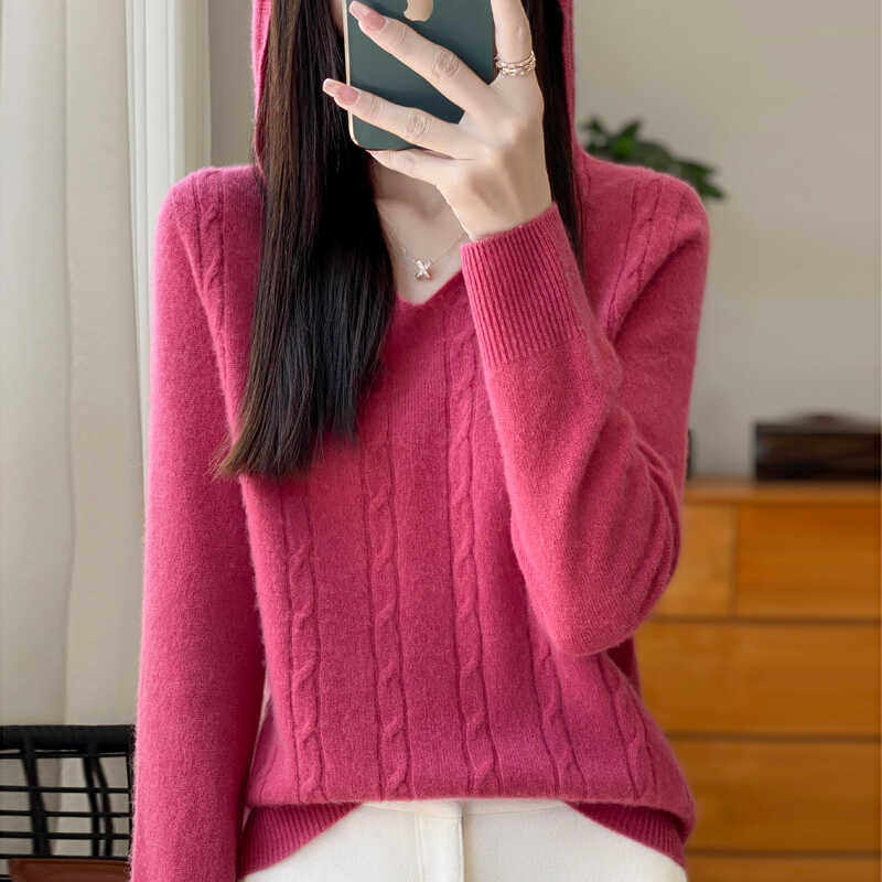 一线成衣100%纯羊绒帽衫女士V领连帽扭花长袖毛衣宽松羊毛衫卫衣