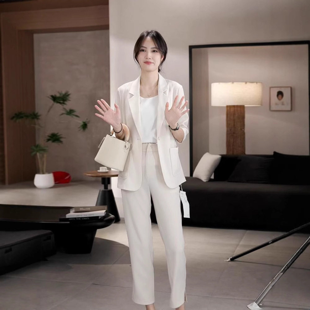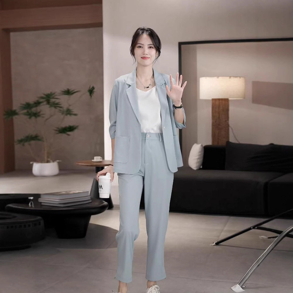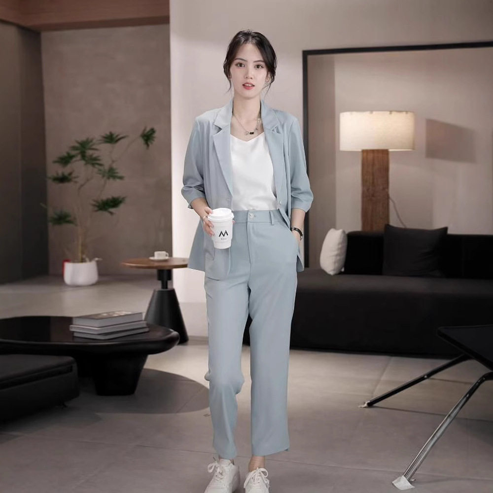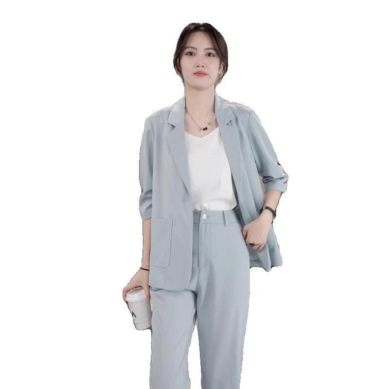 大码女装夏季薄款小西装套装2025新款职业装休闲九分小脚裤两件套