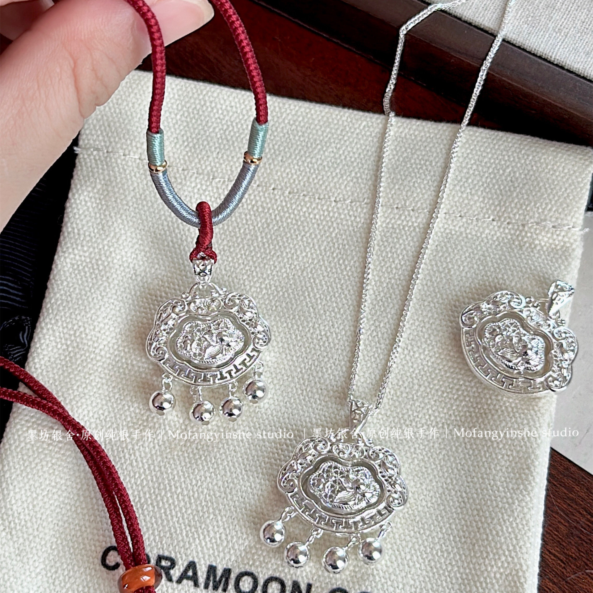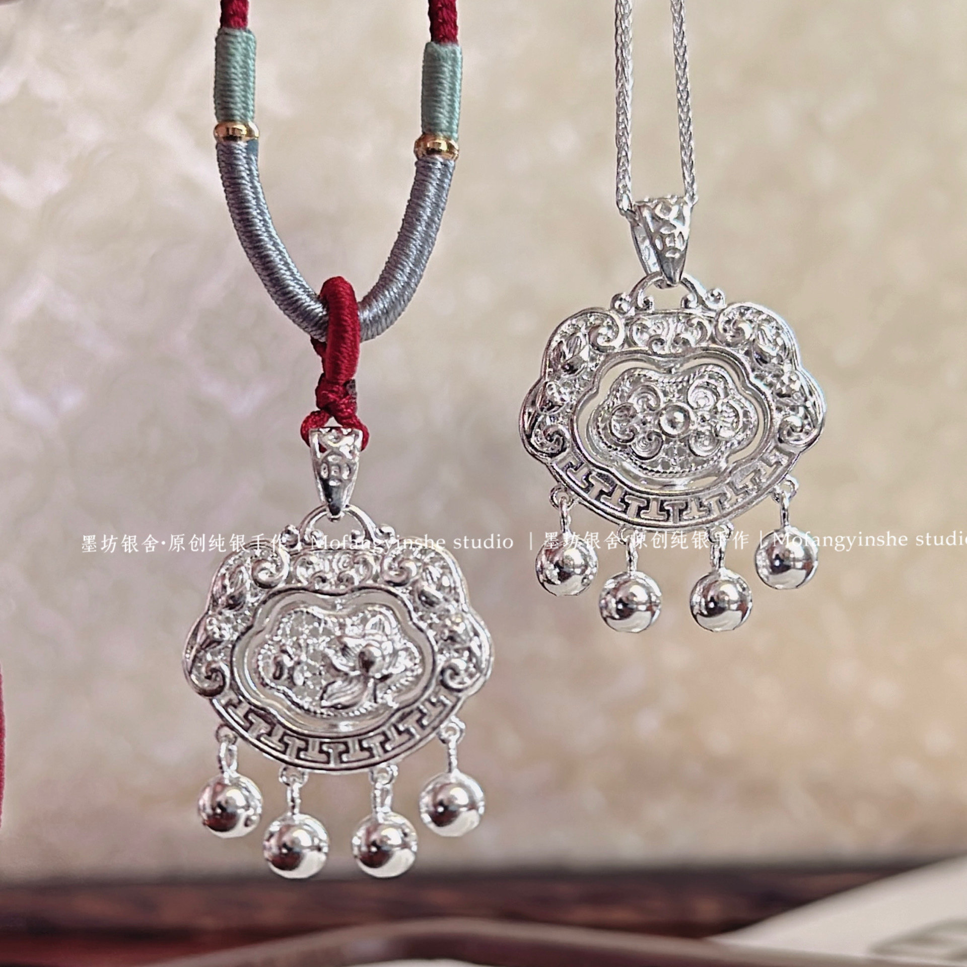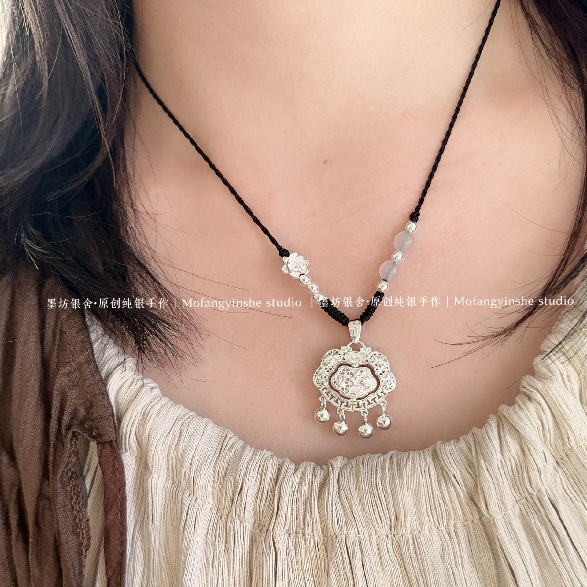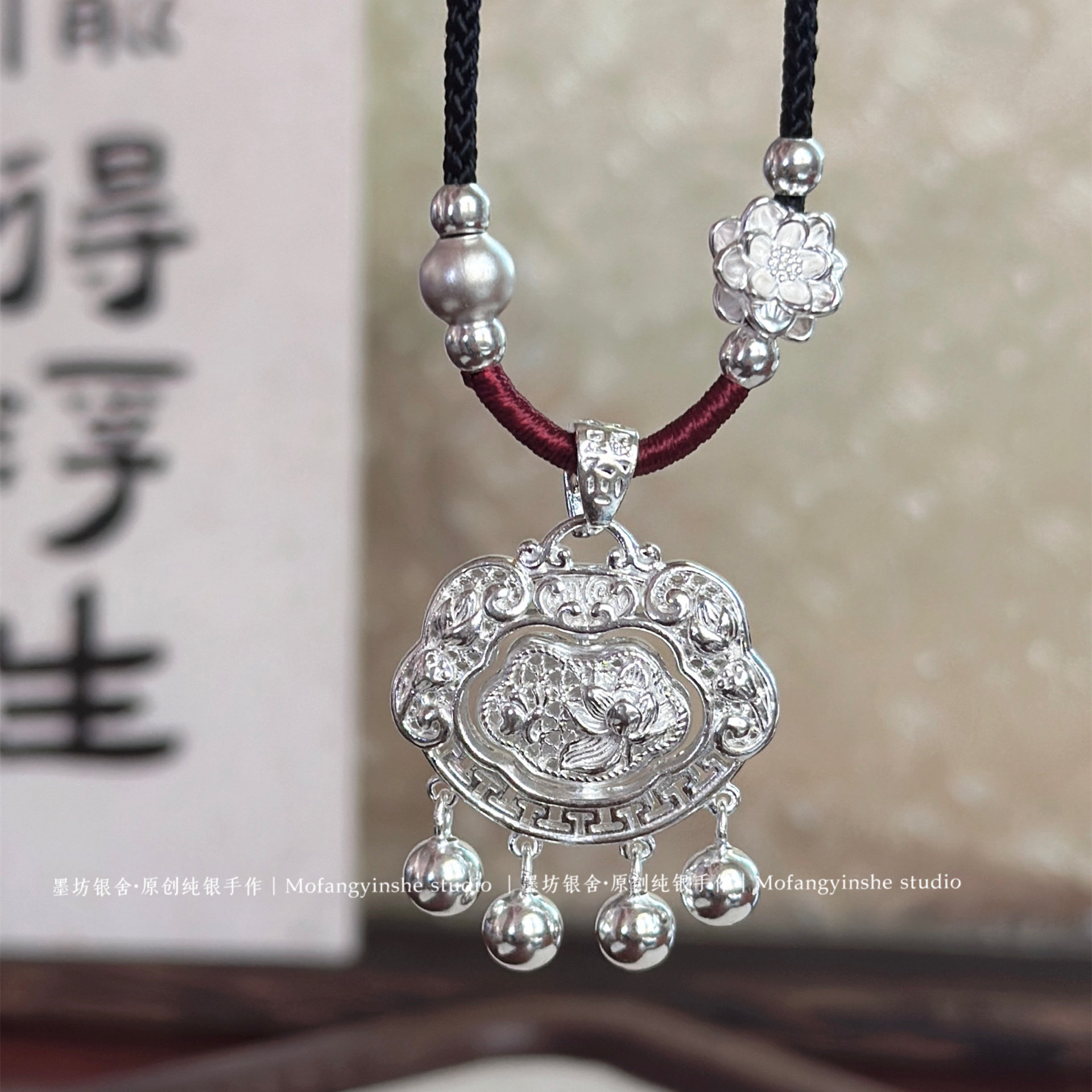 淘宝墨坊银舍,足银999灵动莲花平安锁纯银吊坠手工编织银项链女新中式银锁礼物