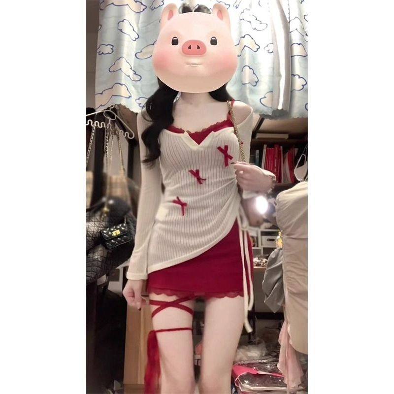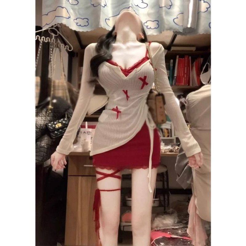 淘宝絮搭,纯欲风性感辣妹红色蕾丝吊带裙女