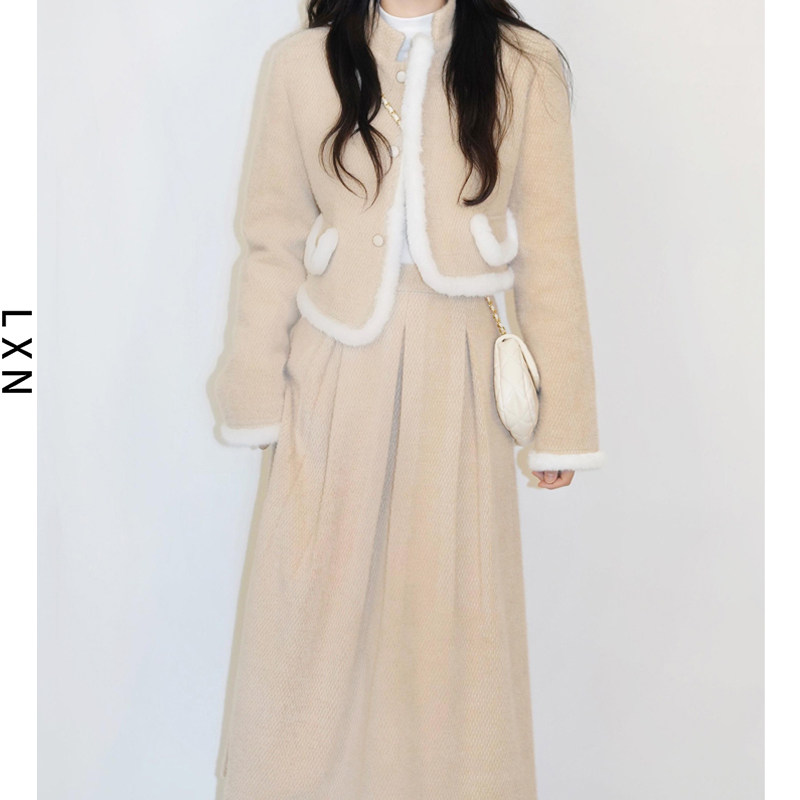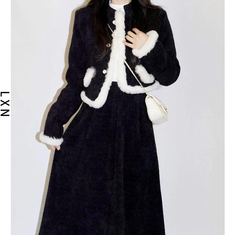 淘宝LXN 鹭向南,深冬搭配一整套韩剧小香风套装裙黑色毛呢子外套高级感显瘦减龄两