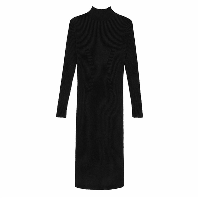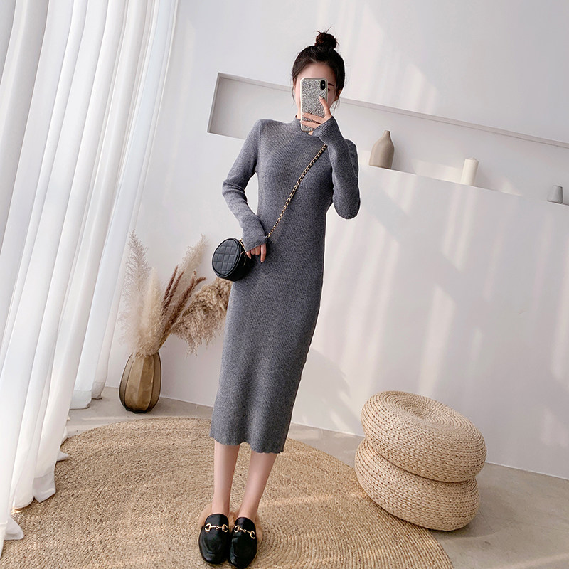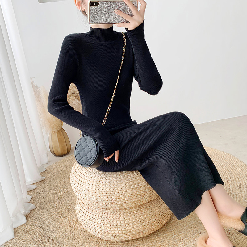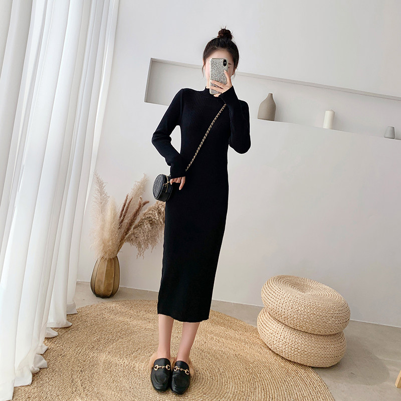 145小个子穿搭150秋冬黑色内搭打底外穿修身针织连衣长裙女半高领