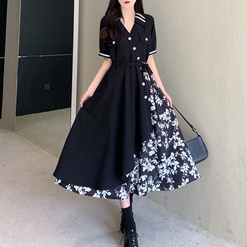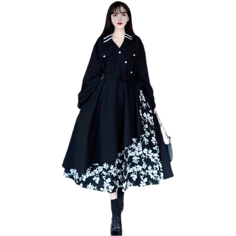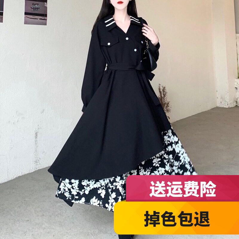 淘宝董小姐 大码女装店,法式复古设计感过膝长裙子秋冬大码收腰拼接碎花大摆不规则连衣裙