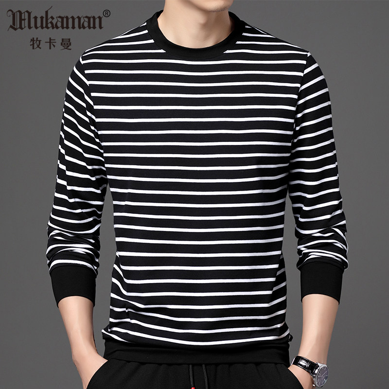 纯棉T恤男士长袖秋装无领上衣黑白细条纹斑马纹圆领秋衣打底体恤