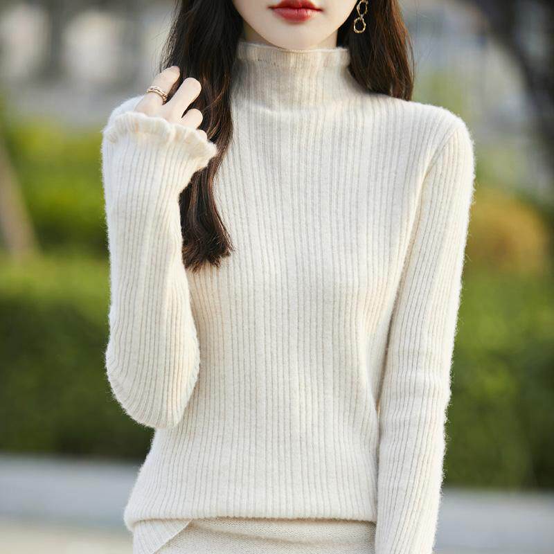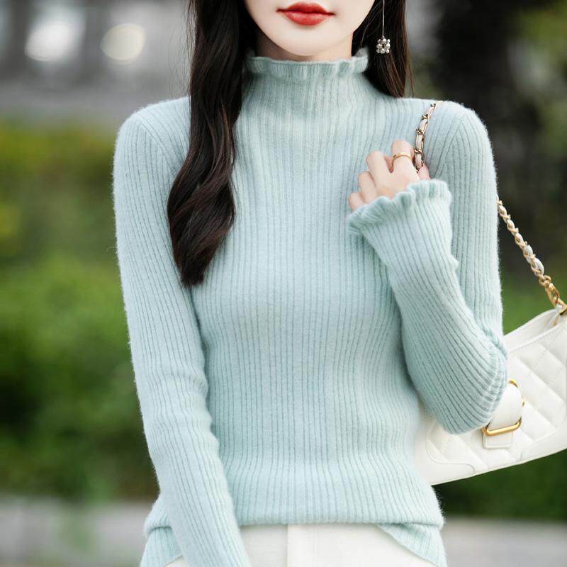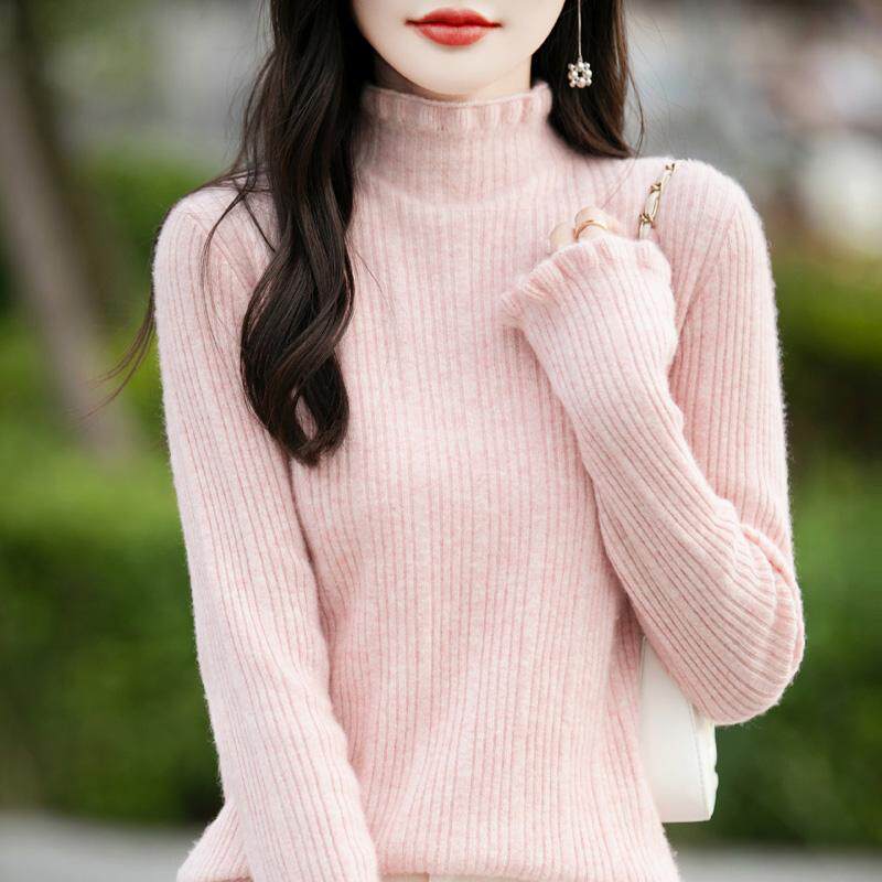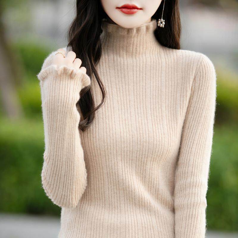 秋冬100%纯羊绒衫女花边领半高领坑条针织毛衣宽松羊毛衫打底上衣