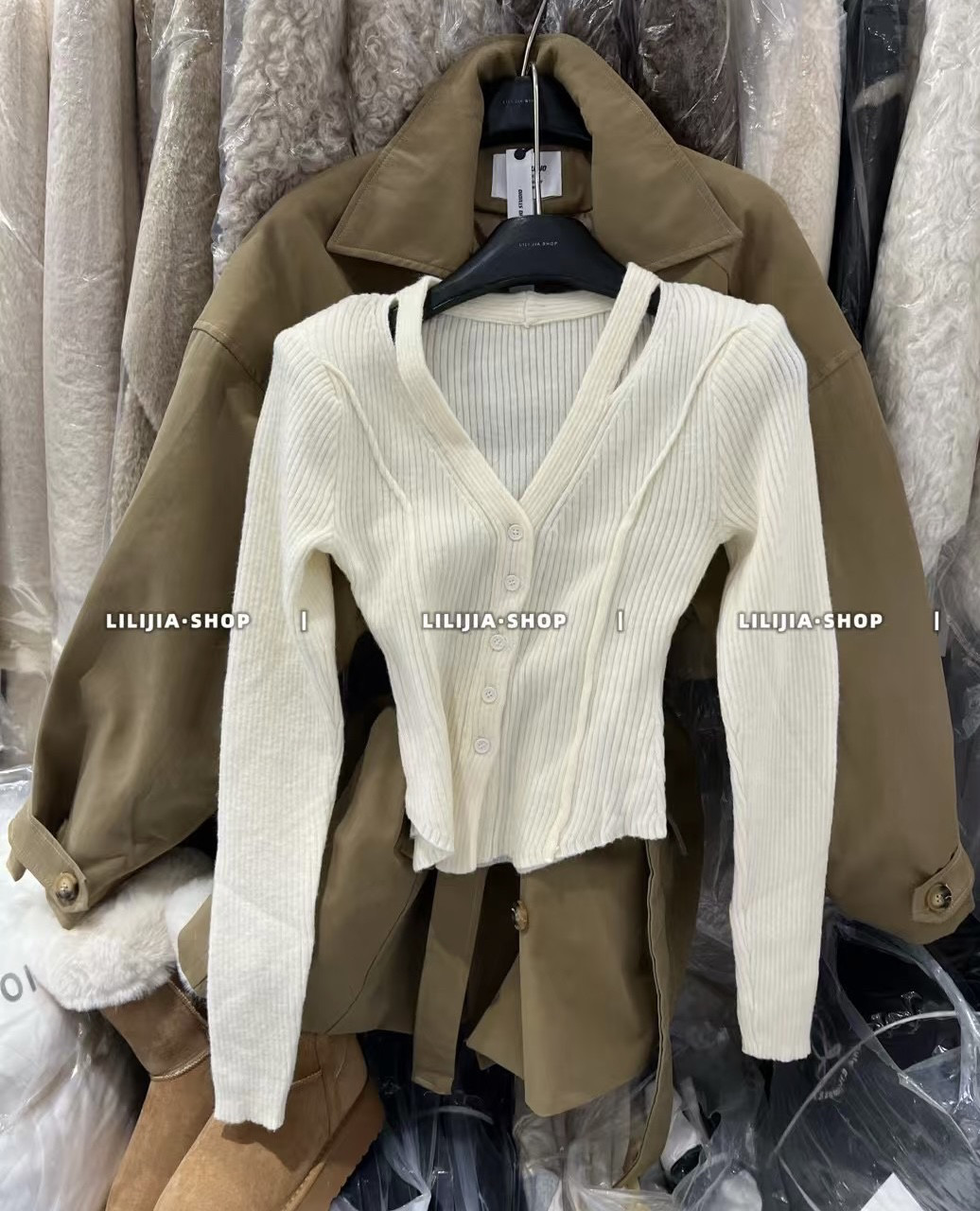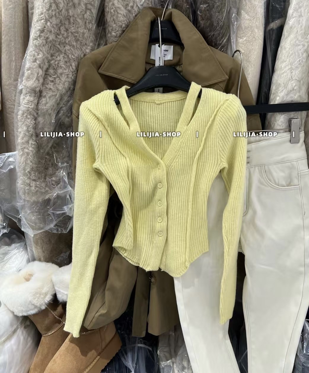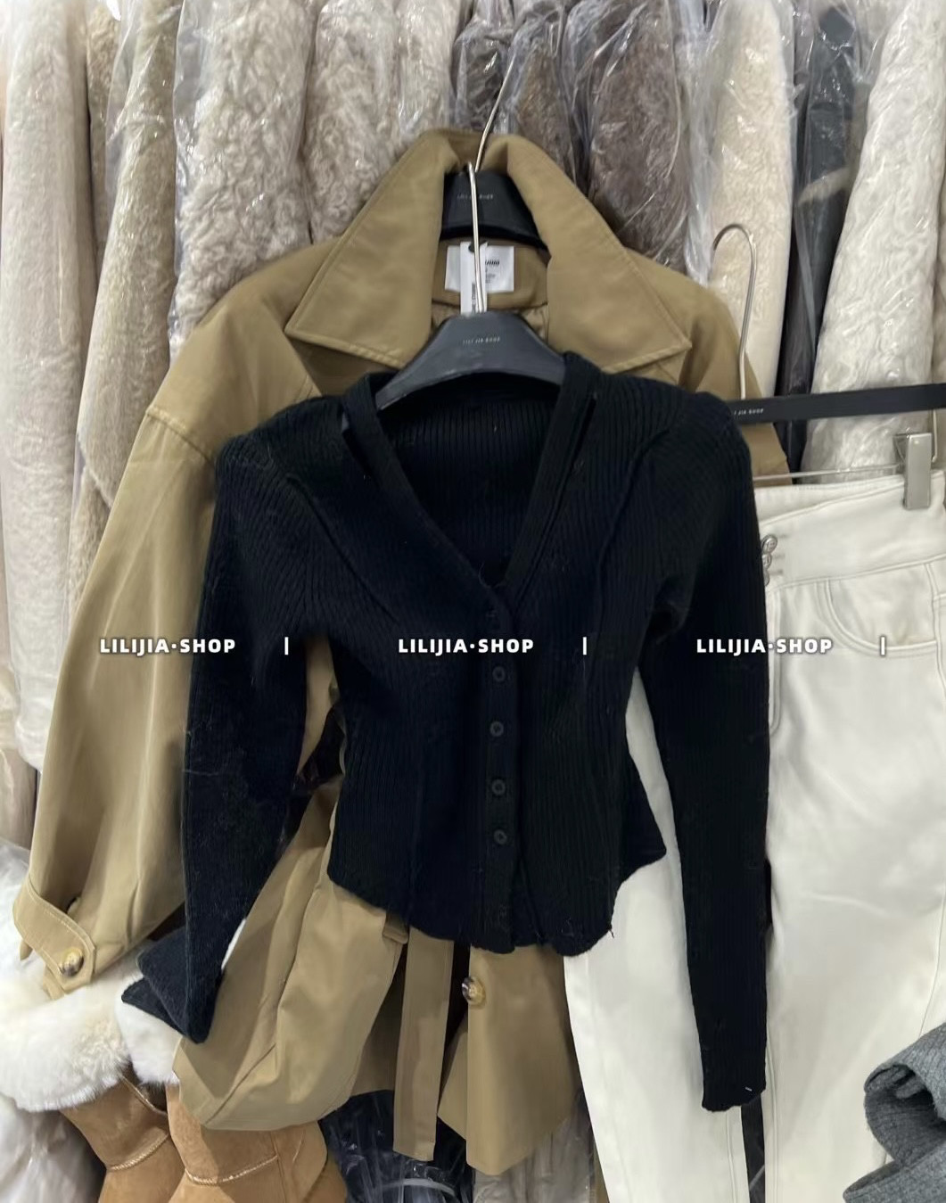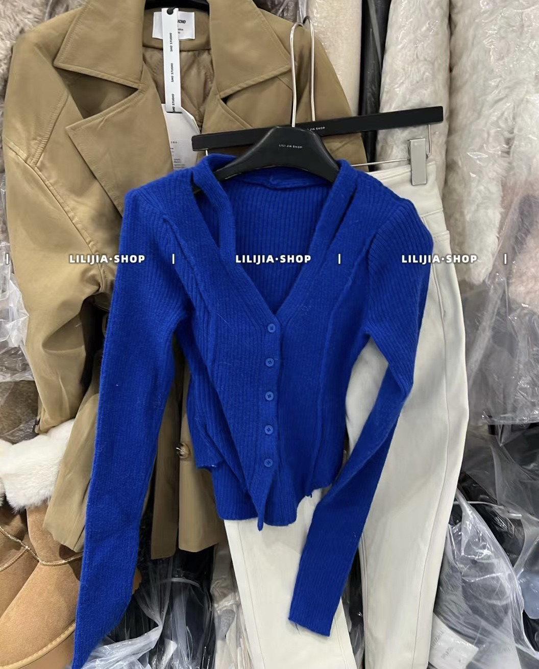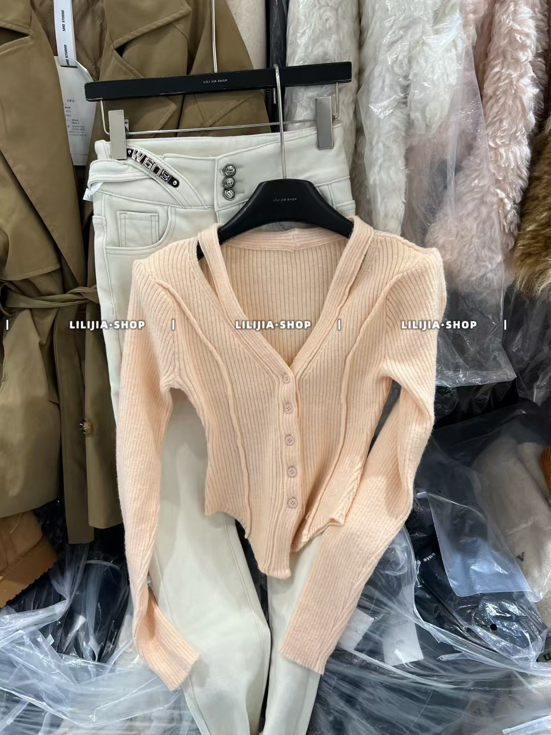 淘宝Miss家 潮流女装馆,Miss家 2024秋新款韩版气质V领长袖针织衫女辣妹显瘦斜角开叉上衣