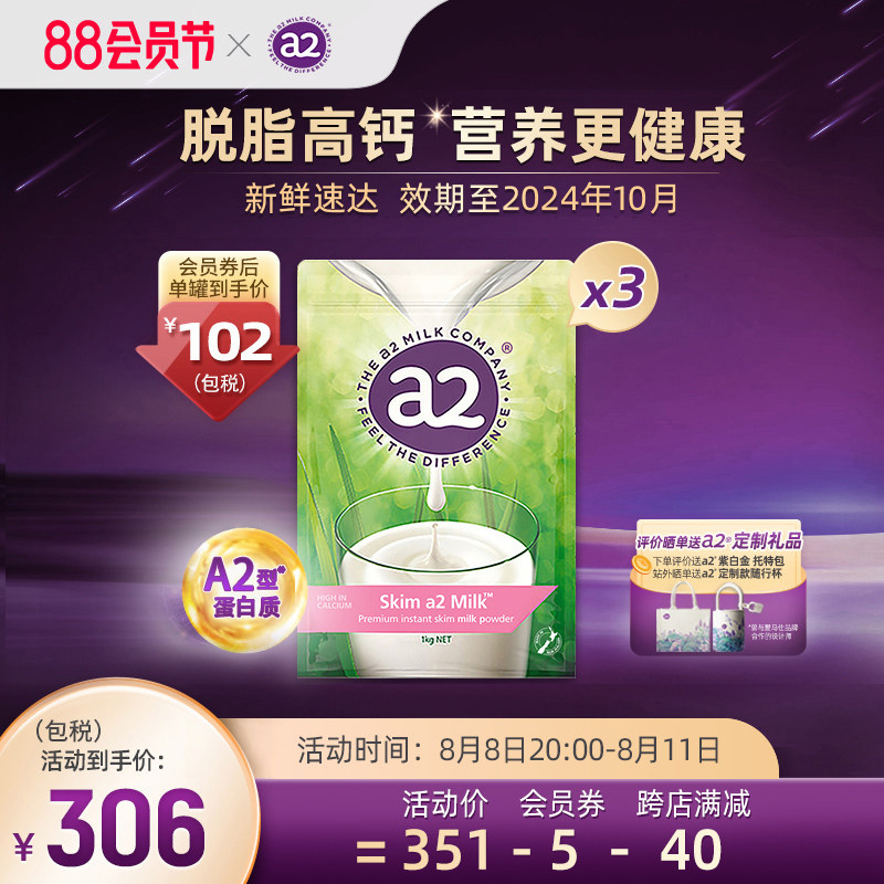 天猫a2海外旗舰店,a2成人高钙脱脂奶粉1kg*3袋,本产品效期至27年1月