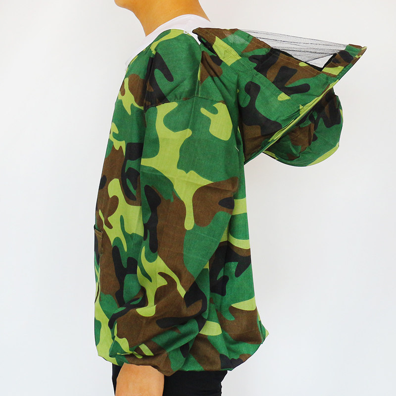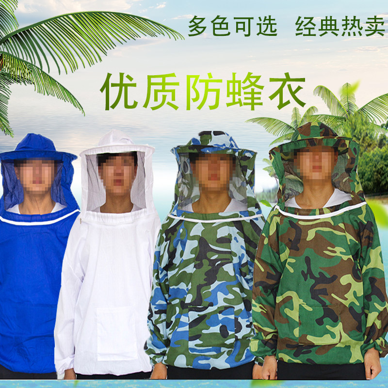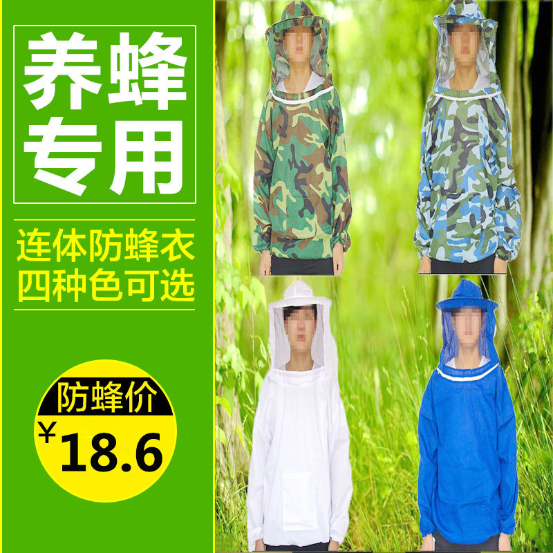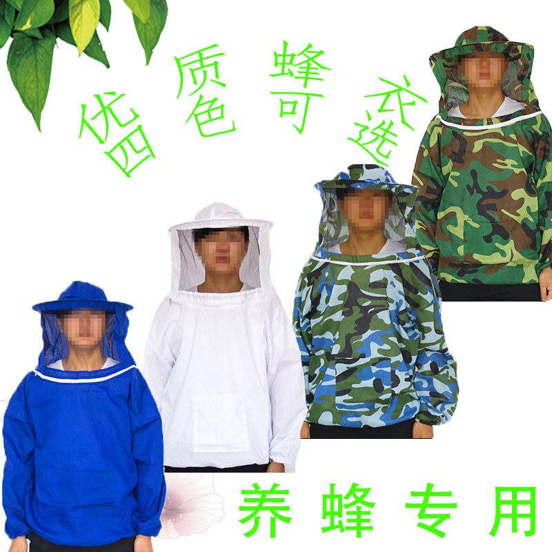 淘宝长葛市亚宾蜂具经营部,防蜂服连体服迷彩蜂衣加厚防蚊服,四色可选,推荐迷彩色,更加耐穿,指定其他颜色拍时备注即可。本蜂衣包含上衣和帽子,帽子采用前网后布。上衣和帽子结合处,后面是连在一起的,前面有一条拉链,可以把帽子放在背后,头从拉链处钻出来。