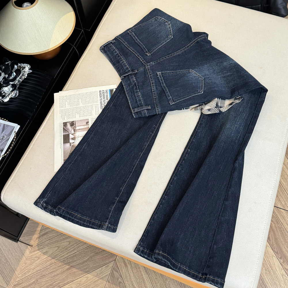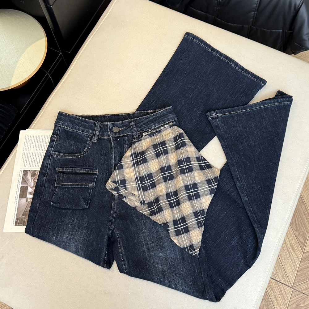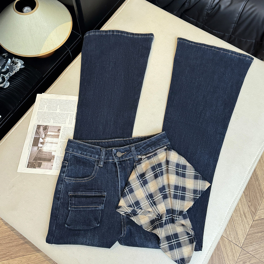 淘宝好运招财铺,实拍韩版设计感拉链格子微喇叭牛仔裤女辣妹高腰修身弹力显瘦裤子