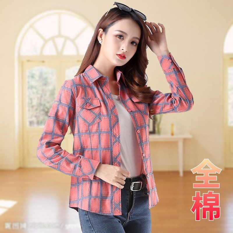淘宝沸点格子,修身格子衬衫女纯棉韩版