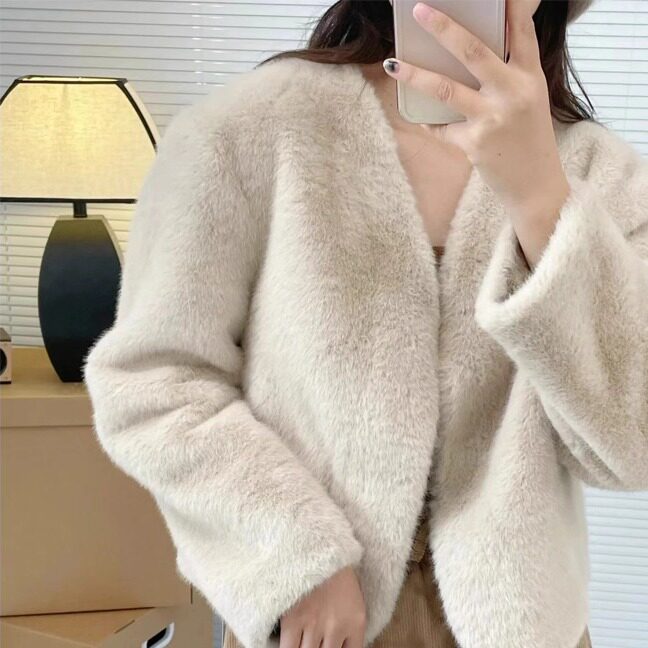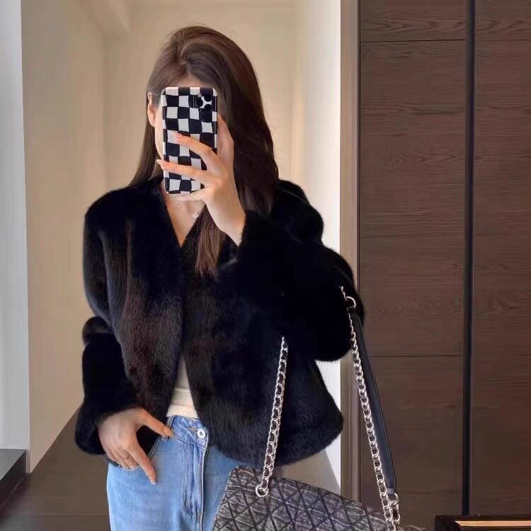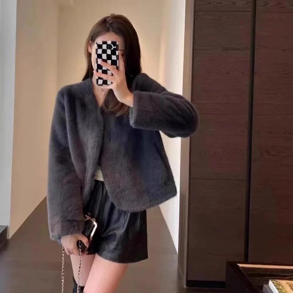淘宝米柚家女装,小香风仿水貂皮毛一体短款外套