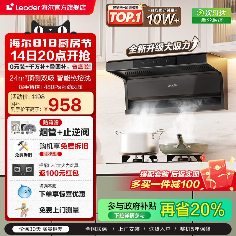 天猫海尔官方旗舰店,海尔智家统帅爆款懒人油烟机,海尔智家leader年度爆款烟机,超薄顶侧双吸