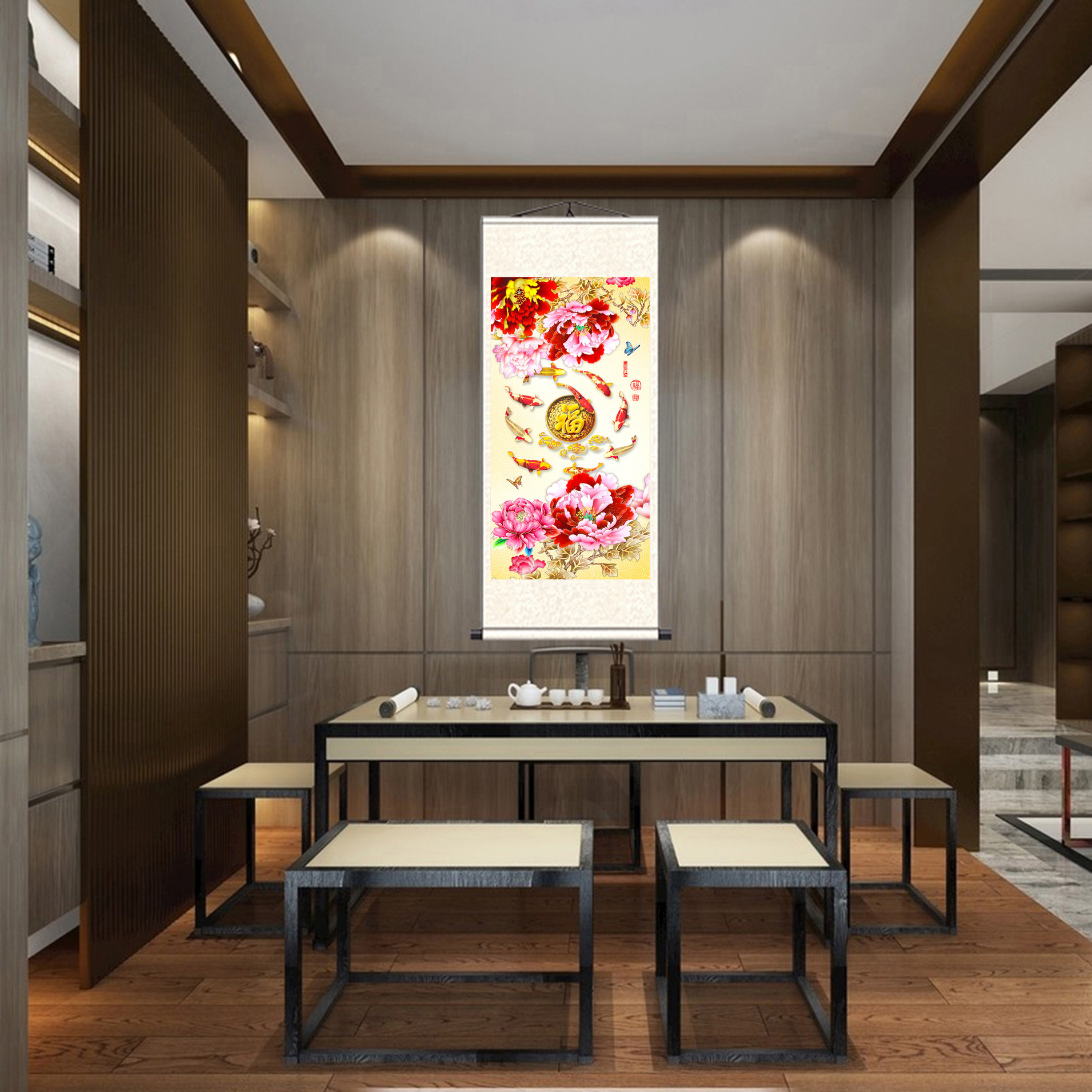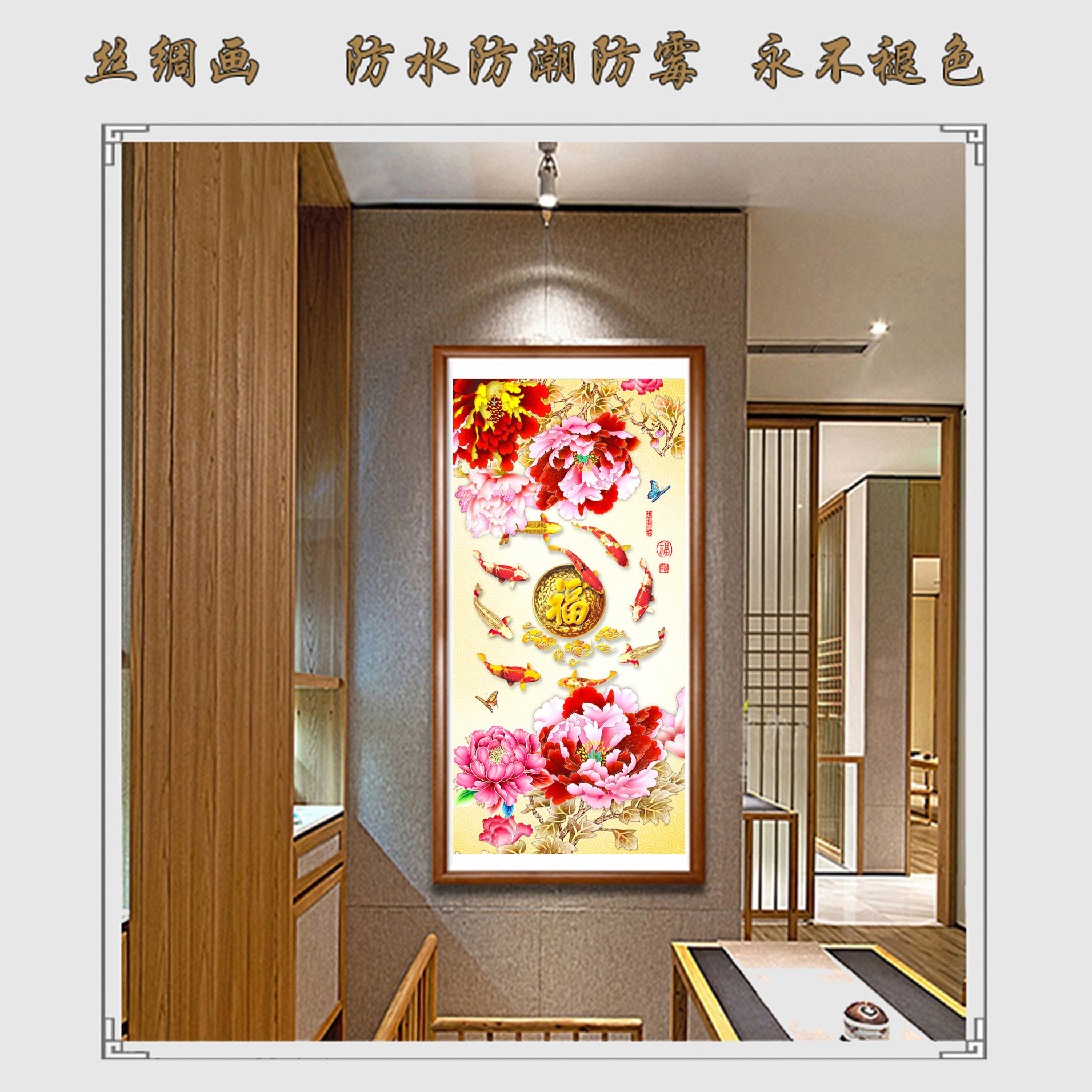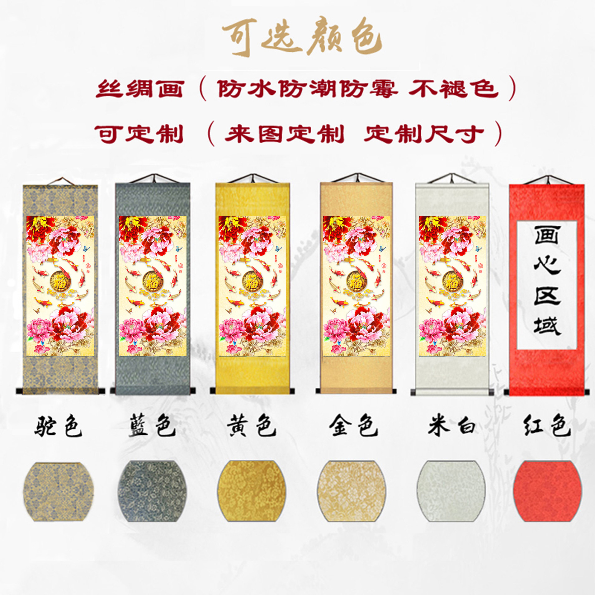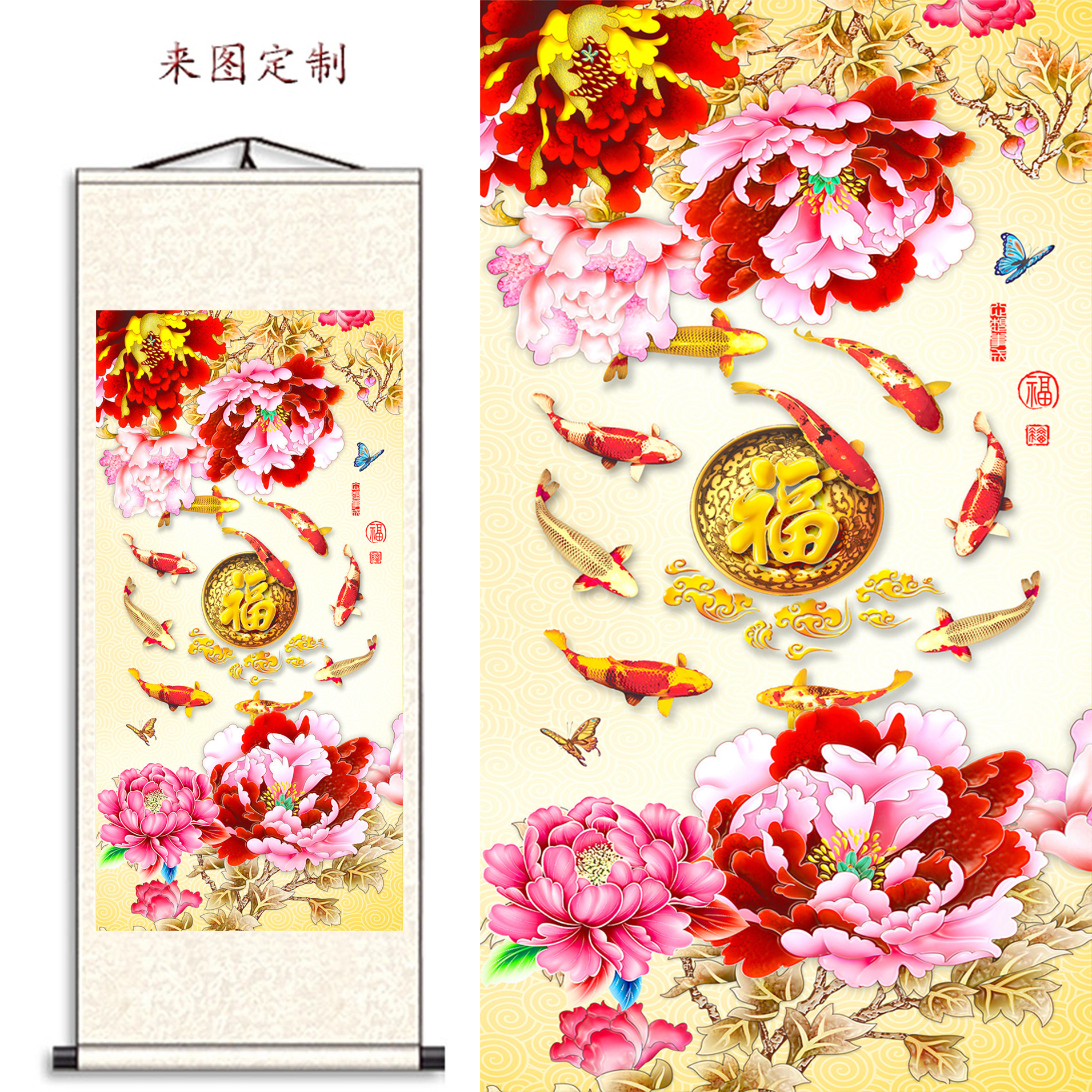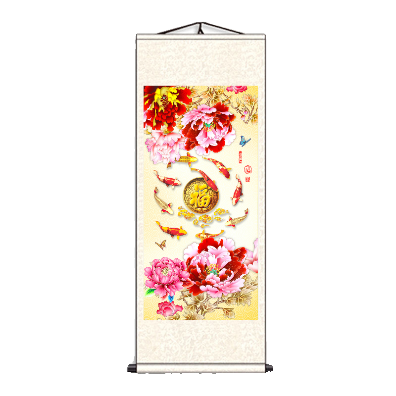淘宝丝绸书画工厂,富贵牡丹九鱼丝绸卷轴挂画