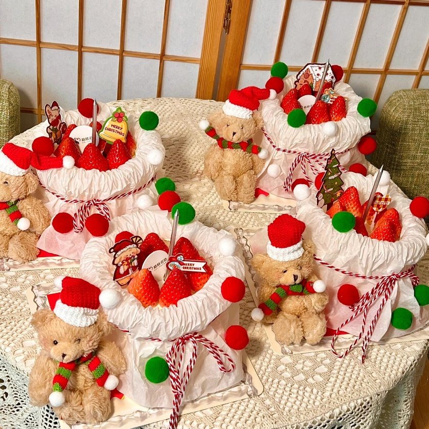 淘宝七十七页甜品烘焙批发,2025圣诞节围巾小熊蛋糕装饰红白绿混款小毛球雪梨纸烘焙装扮配件