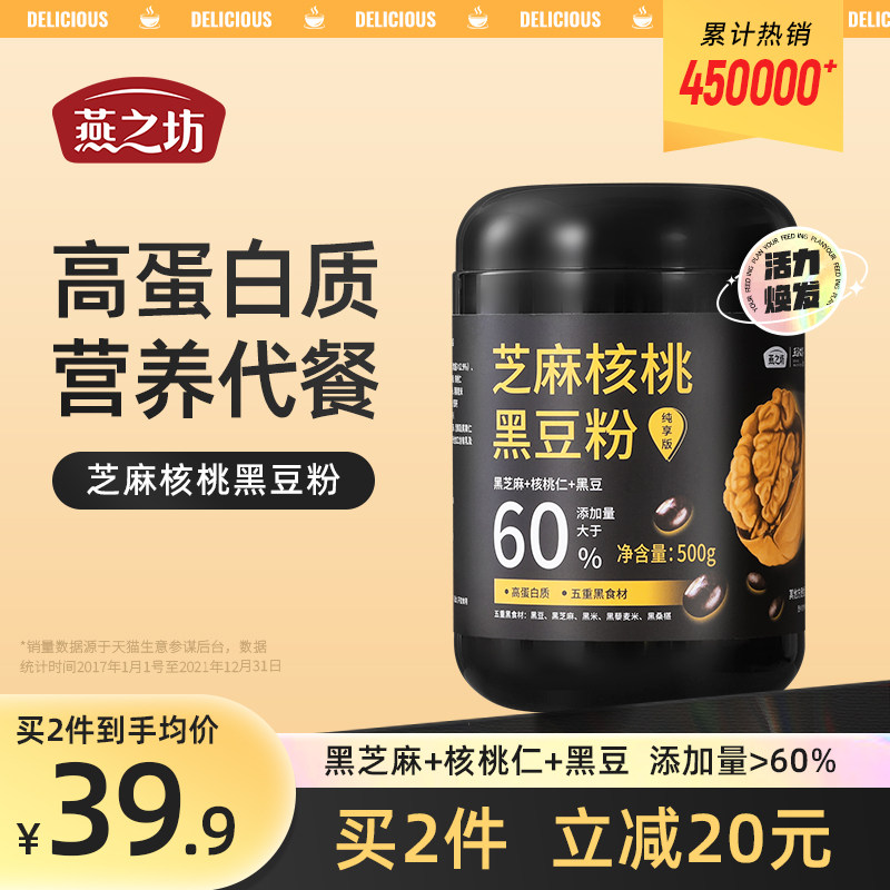 天猫燕之坊旗舰店,燕之坊黑芝麻核桃黑豆粉桑葚粉糊,5重黑营养 营养代餐 高纤高蛋白 熬夜常备