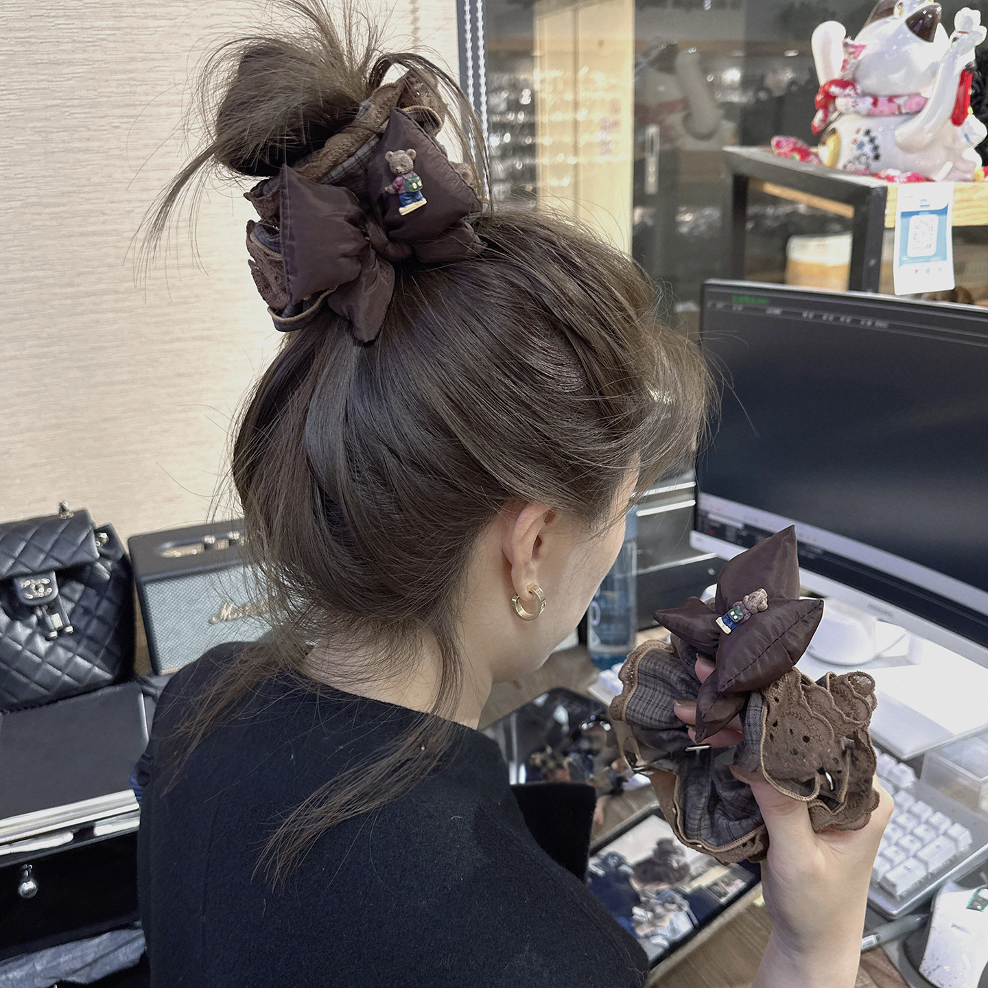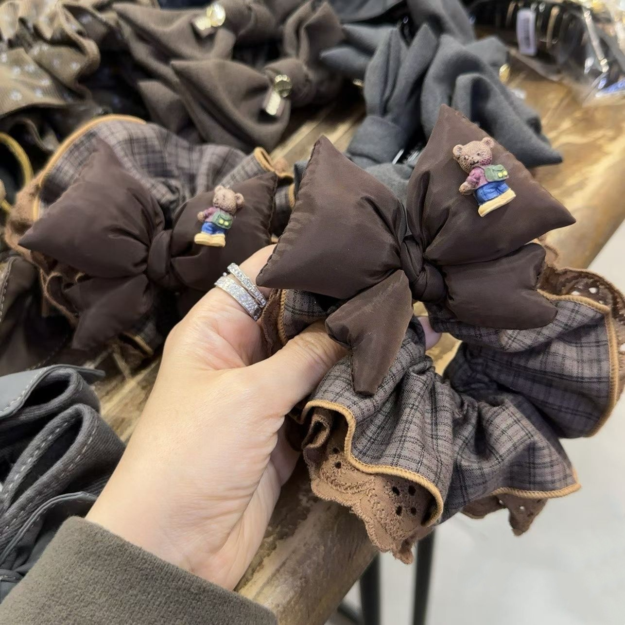 淘宝初见家居日用,高级美拉德咖色充棉蝴蝶结格子大肠发圈大版显发量丸子头发绳头绳