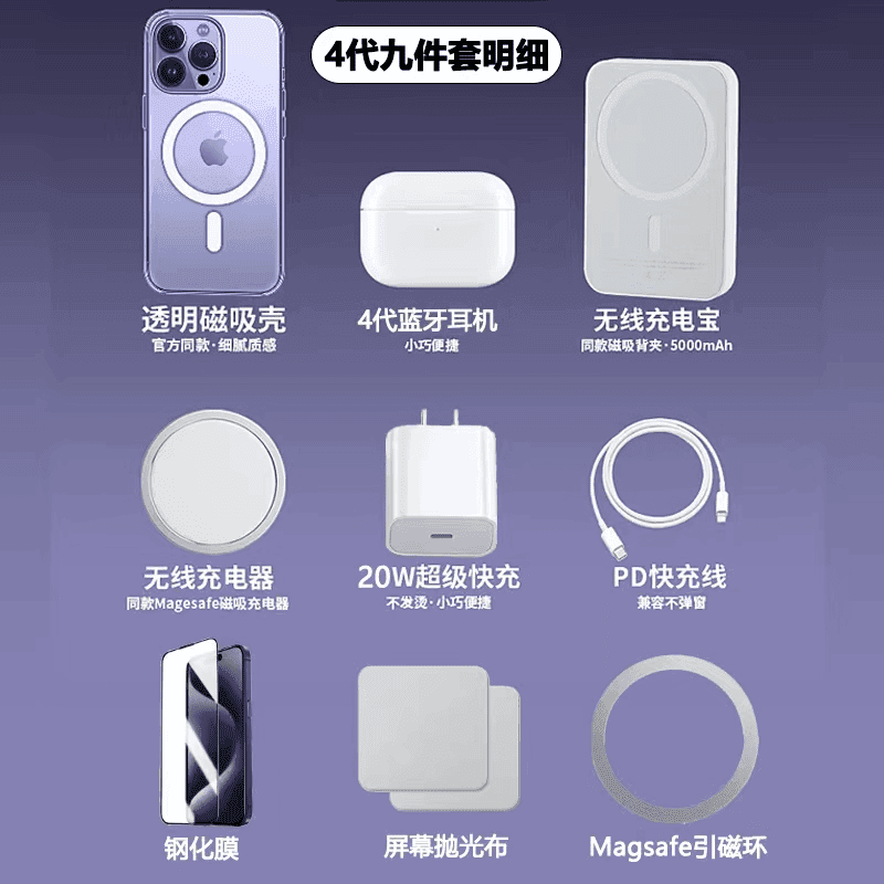 淘宝淘系工厂3C数码充电宝,华强北九件套适用苹果8-16系列磁吸无线充电器蓝牙耳机充电头手表