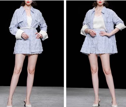 淘宝Daily Fabulous精品女装店,Daily Fabulous秋装女装新款菱格流苏浅蓝衬衣外套高腰短裤套装