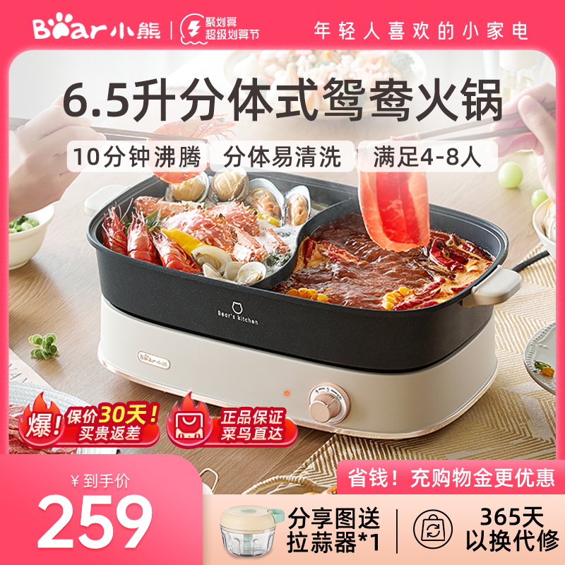 天猫小熊电器官方旗舰店,【加长版6.5L】分体双控鸳鸯火锅,6.5升大容量 分体式易清洗 双旋钮独立温控