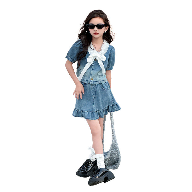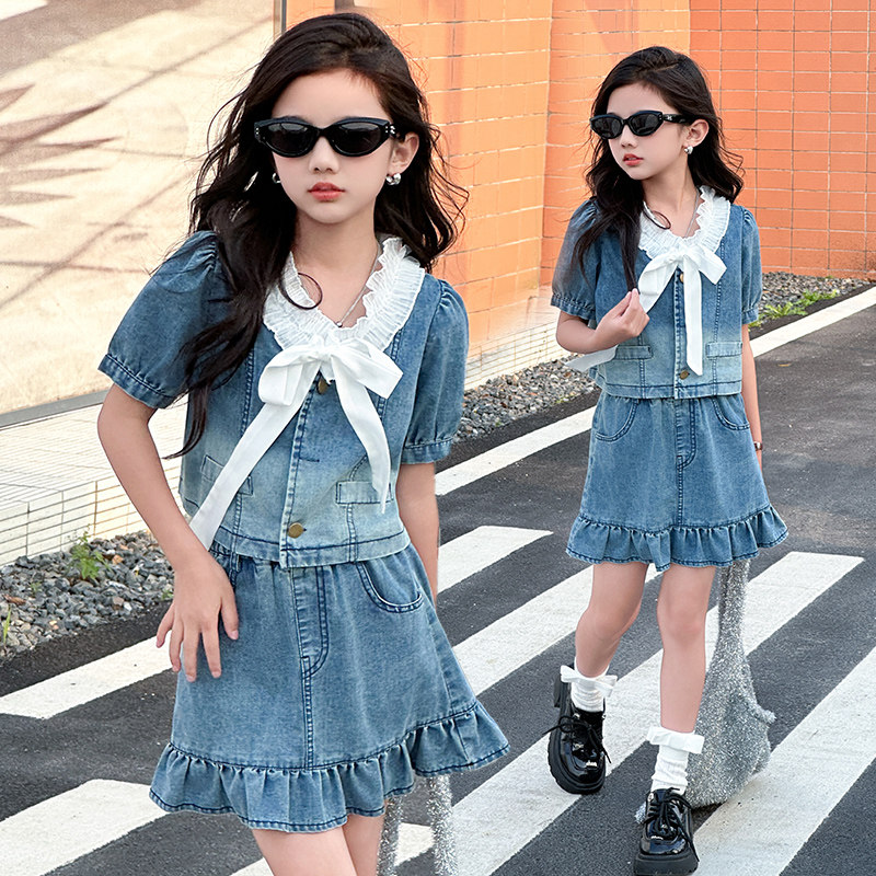 女童夏装套装2024新款大儿童牛仔短袖时髦夏季小孩短裙两件套洋气