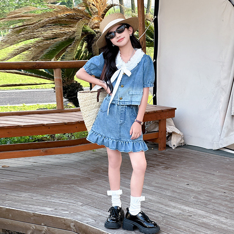 女童套装夏季儿童牛仔短裙两件套