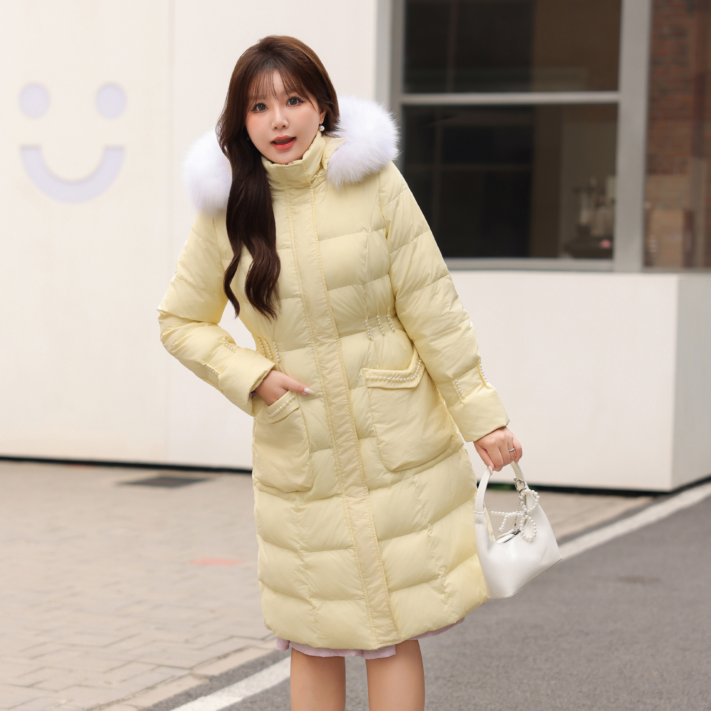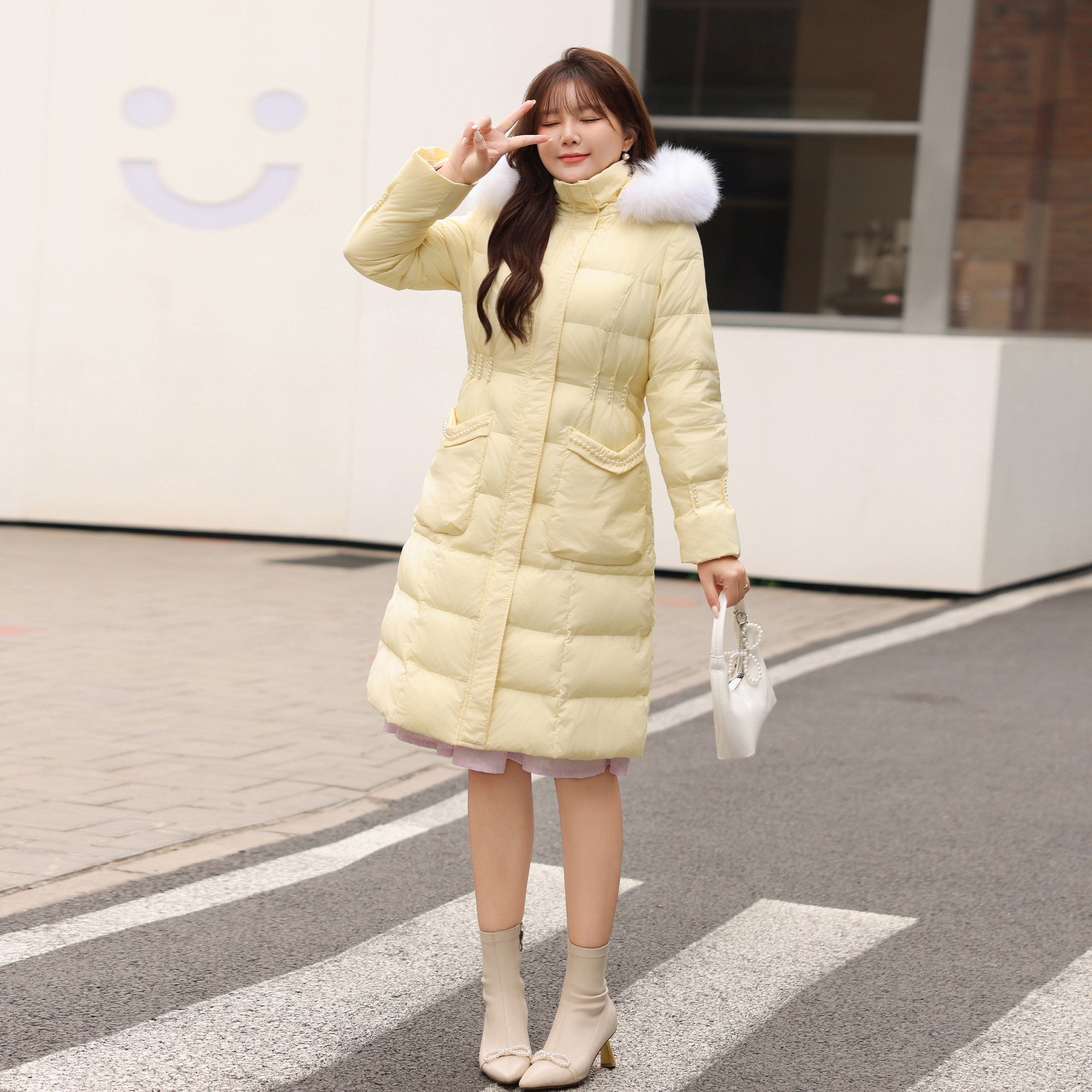 DM100大码百分百微胖mm女收腰90白鸭绒羽绒服连帽正肩中长款外套