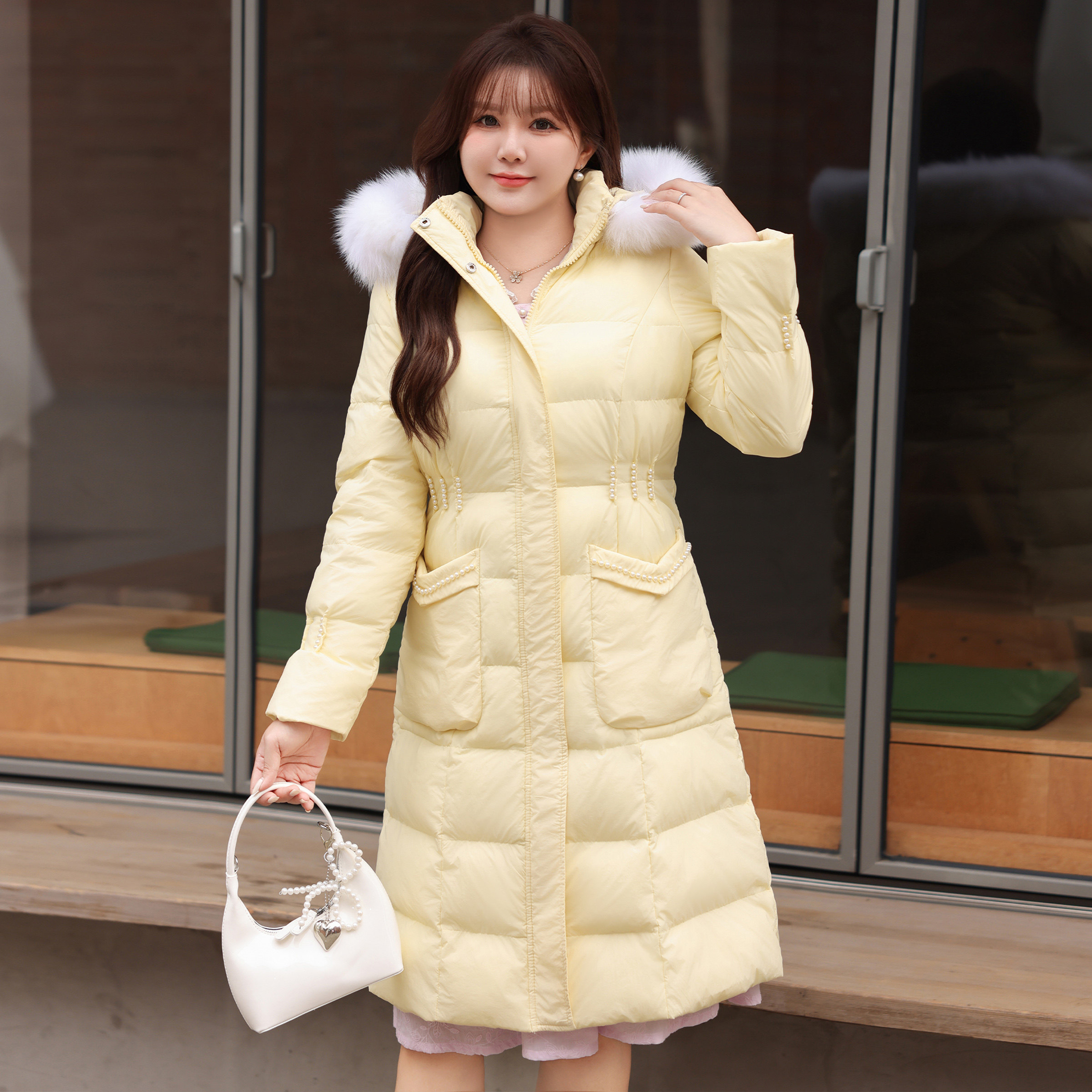 胖MM加厚中长真毛领钉珠连帽棉服