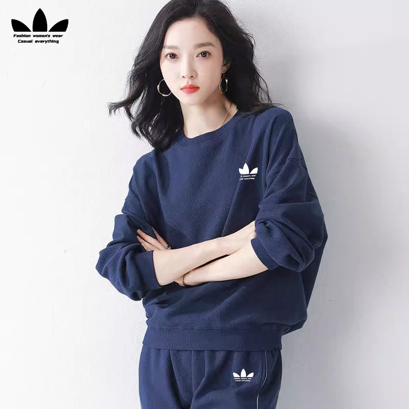 淘宝三叶草工厂折扣店,运动三叶草华夫格休闲套装女春秋季时尚宽松洋气减龄卫衣两件套潮