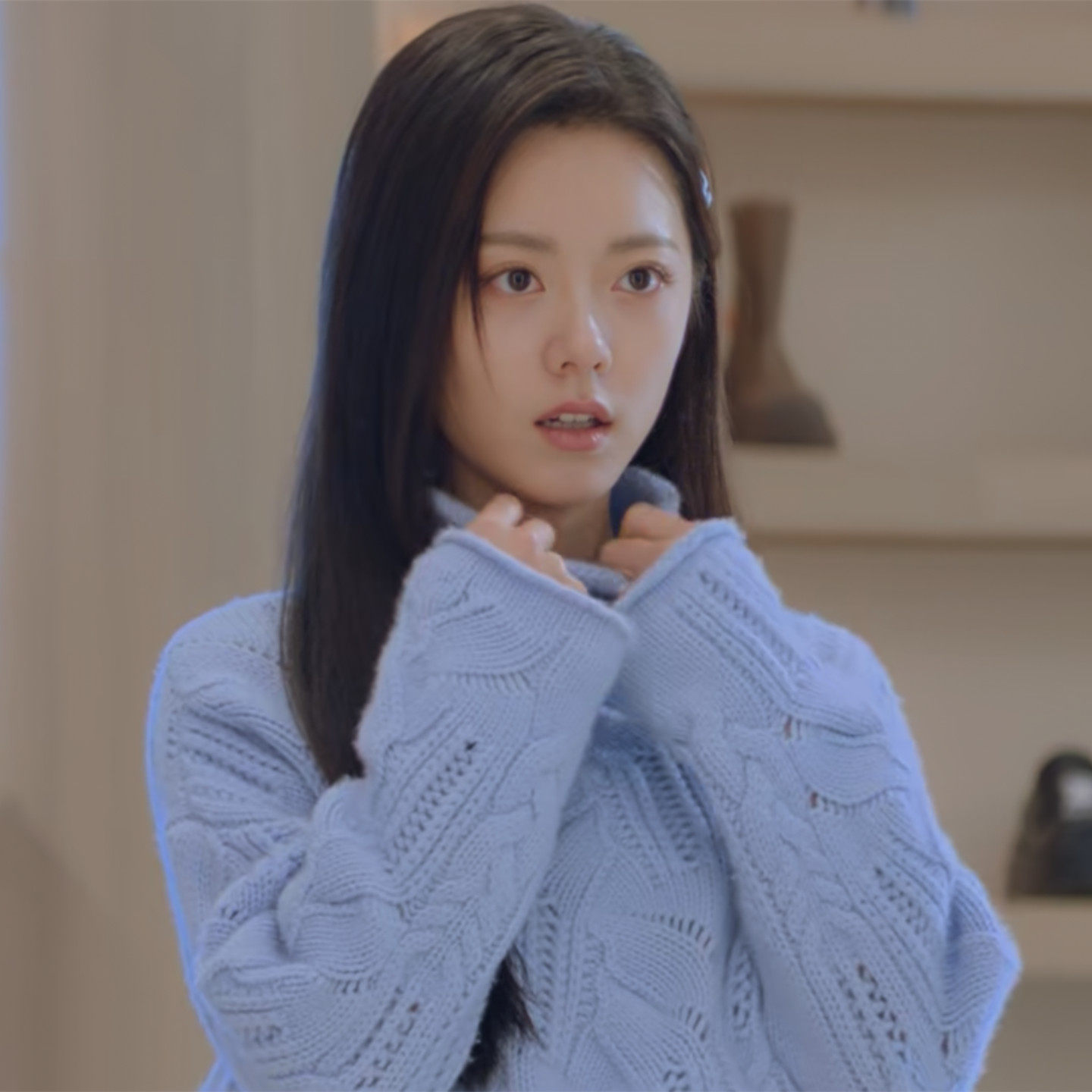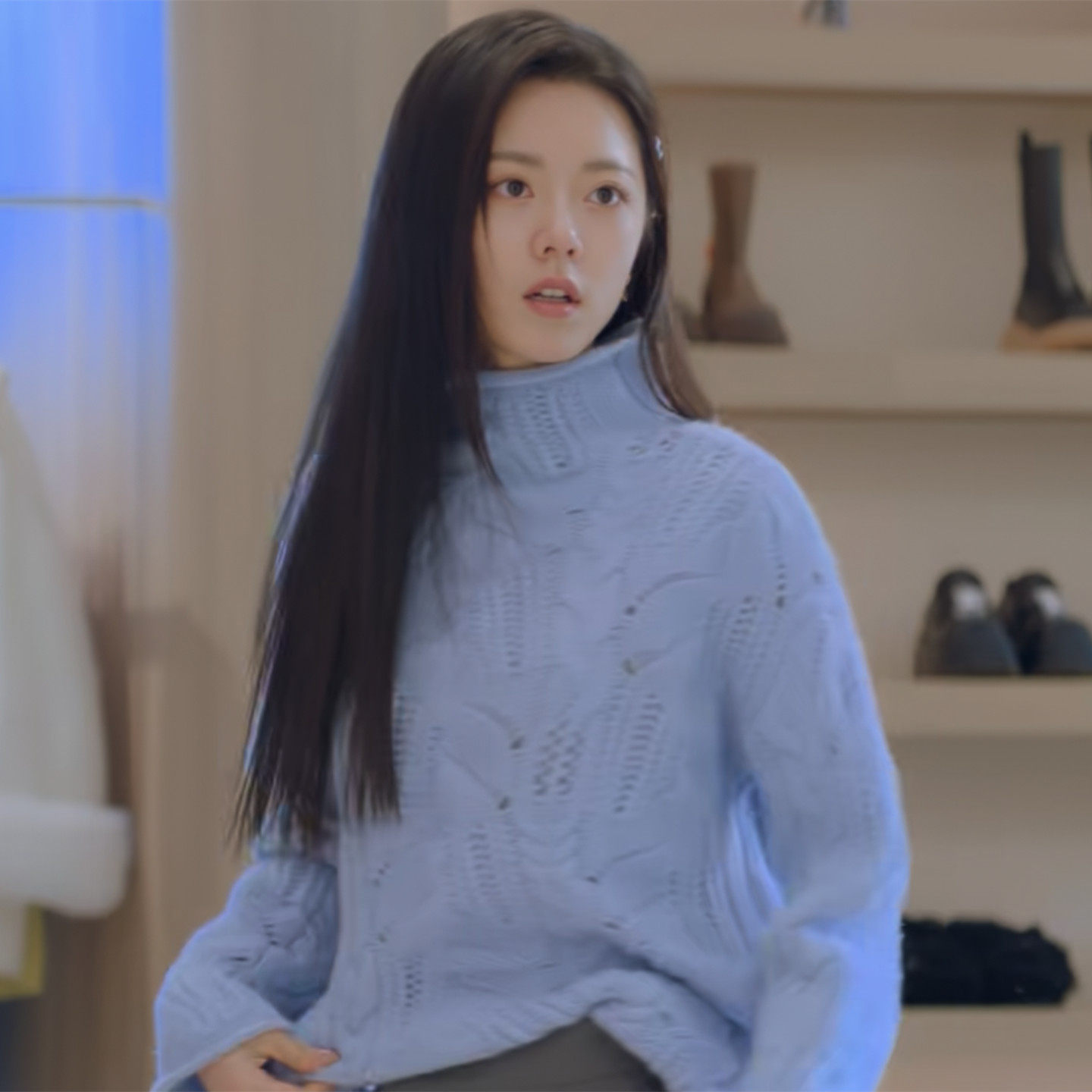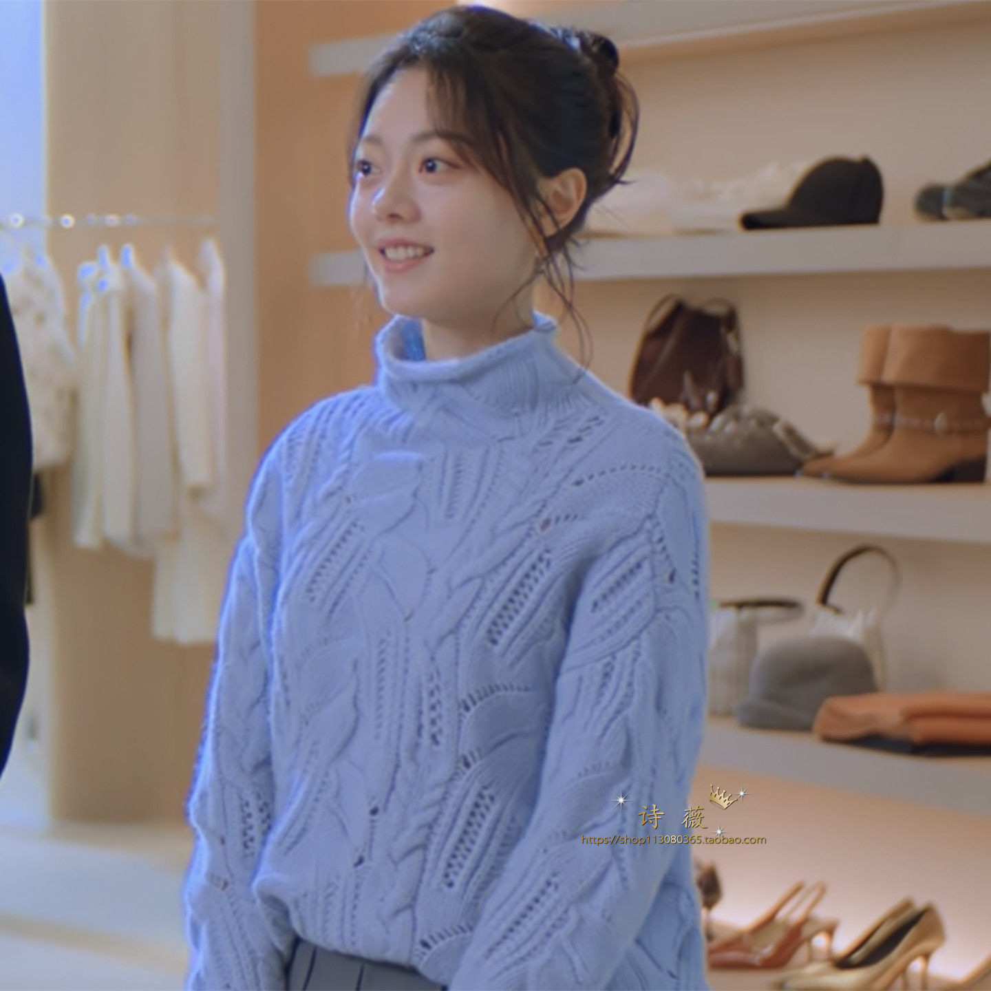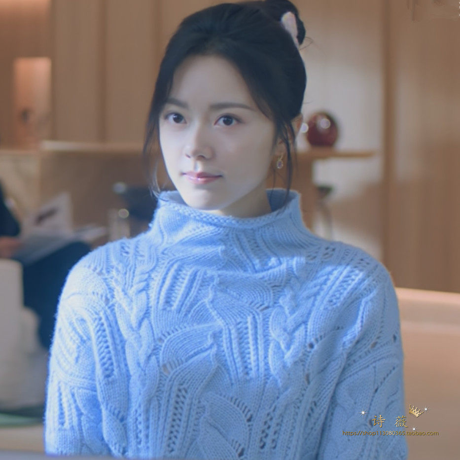 淘宝诗 薇,蓝色高领镂空钩花长袖宽松针织衫