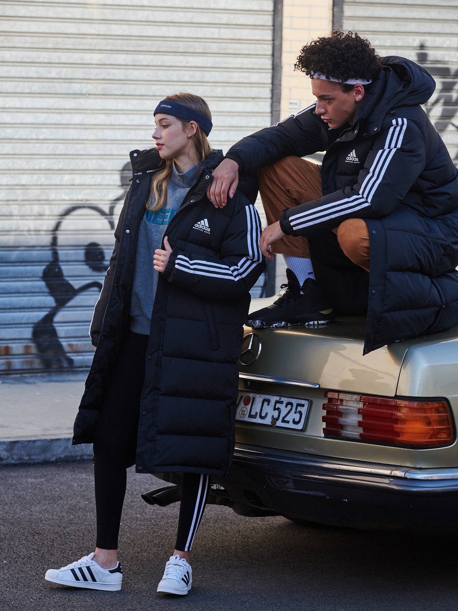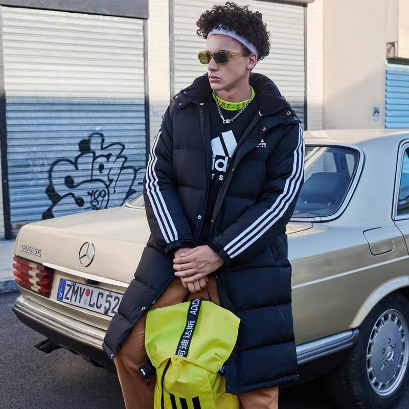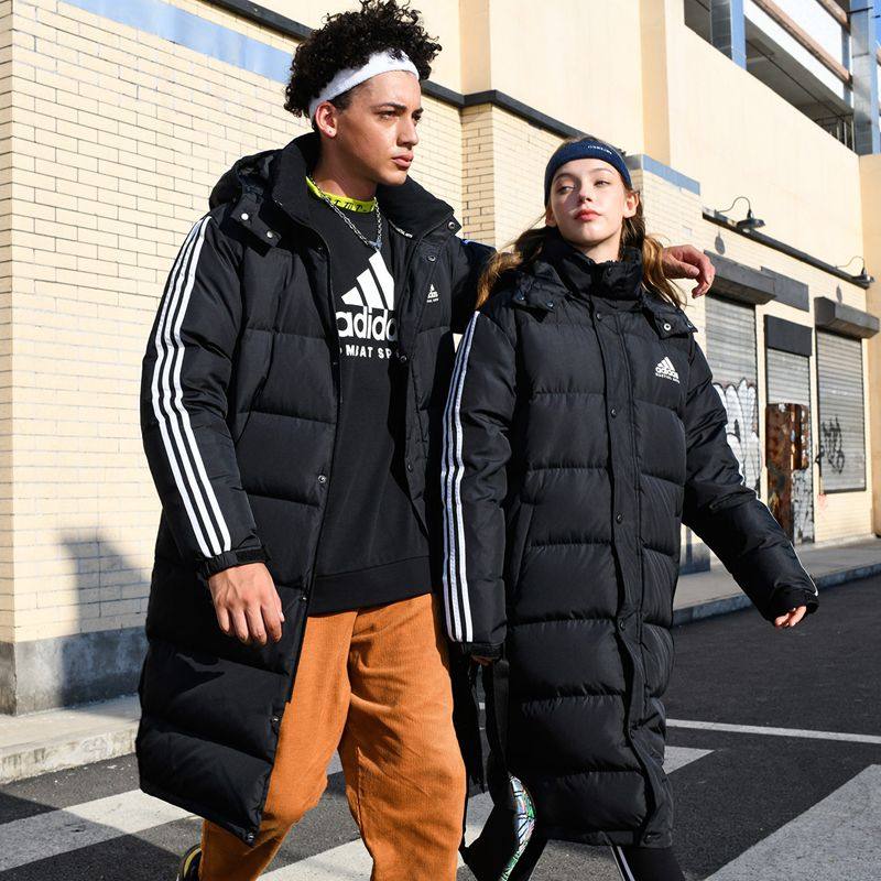 Adidas阿迪达斯正品男女三条纹运动休闲中长款保暖羽绒服情侣外套