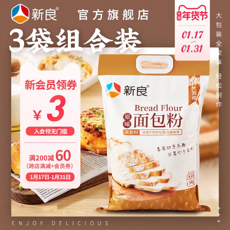 天猫新良食品旗舰店,新良原味面包粉5kg*3高筋烘焙粉,稳定性好、吸水率高